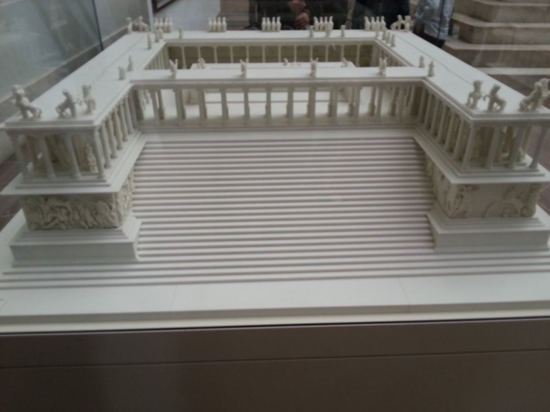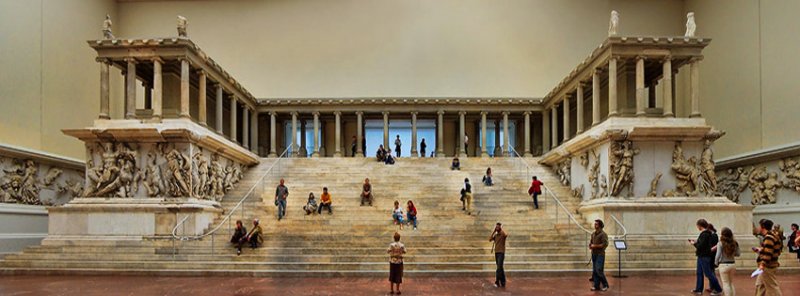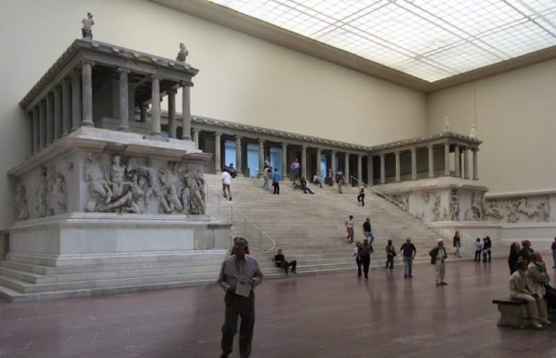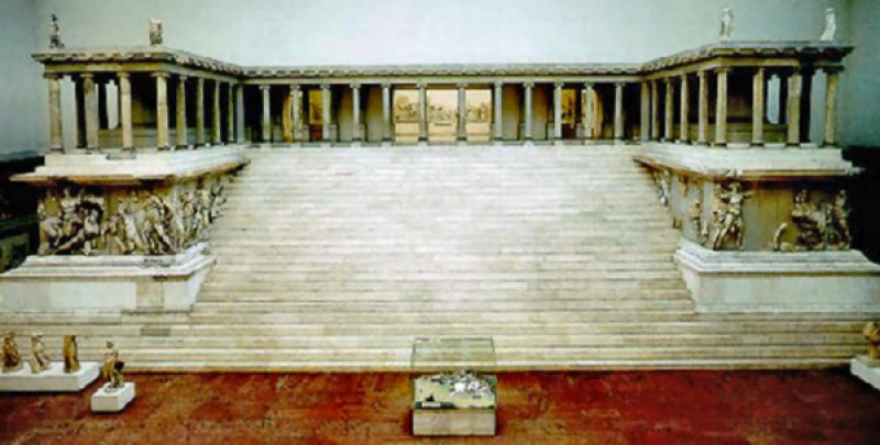 2. Pergamon'daki Zeus Sunağı ( Bergama) Berlin müzesi Bergama Zeus Sunağı ya da Zeus Altar'ı MÖ 2. yüzyılda, Kuzey Batı Anadolu'da, İzmir'in kuzeyinde bulunan antik Pergamon şehrinde Pergamon Krallığı'nı yöneten Attalos hanedanı tarafından yaptırılmış mermerden anıtsal dinsel yapıdır. At nalı biçimdeki yapı Bergama Akropolü üzerinde bulunur. 35,64 m genişliğinde 33,4 m derinliğindedir. Yapının ön tarafında bulunan merdivenler 20 mt genişliğindedir.