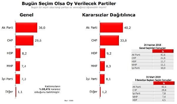 Ayrıca 'Türkiye’de bugün bir seçim olsa oyunuzu kime verirsiniz?' sorusuna katılımcıların, kararsızlar (%10,4) dağıtıldıktan sonra, yüzde 40,2’si AK Parti,yüzde 33’ü CHP, yüzde 9,2’si HDP, yüzde 8,3’ü MHP, yüzde 8,1’i ise İyi Parti yanıtını verdi.