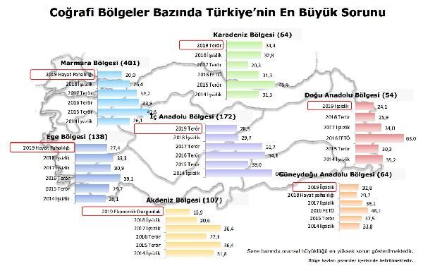 Öte yandan, coğrafi olarak bakıldığında Ege ve Marmara Bölgelerinde en büyük sorun ‘hayat pahalılığı’ olurken, Güneydoğu Anadolu ve Doğu Anadolu’da ‘işsizlik’, Karadeniz ve İç Anadolu Bölgesi’nde ‘terör, Akdeniz Bölgesi’nde ise ‘ekonomik durgunluk’ oldu.