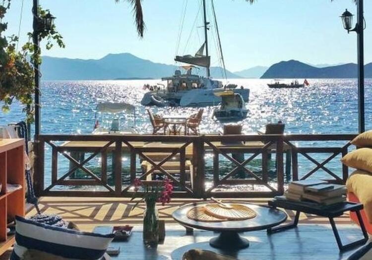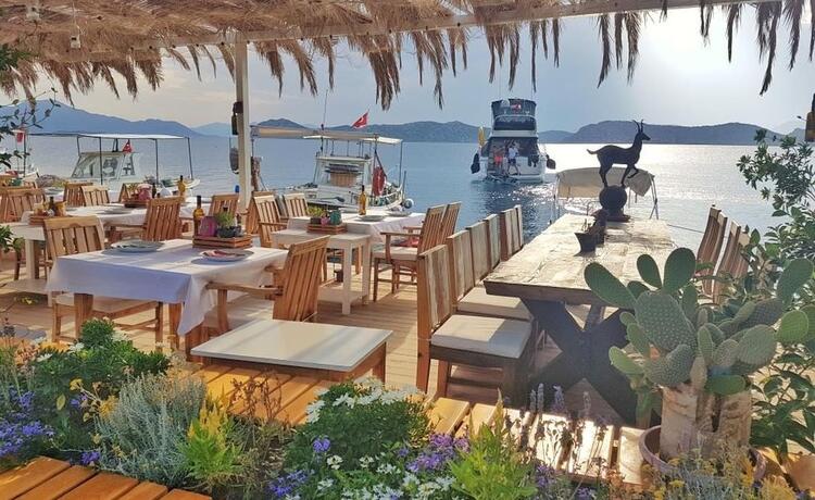 Bozburun Yarımadası'nın yaygın bir klasiği olarak; deniz kenarında şezlongların bulunduğu iskeleler, akşam olunca restoran oluyor.