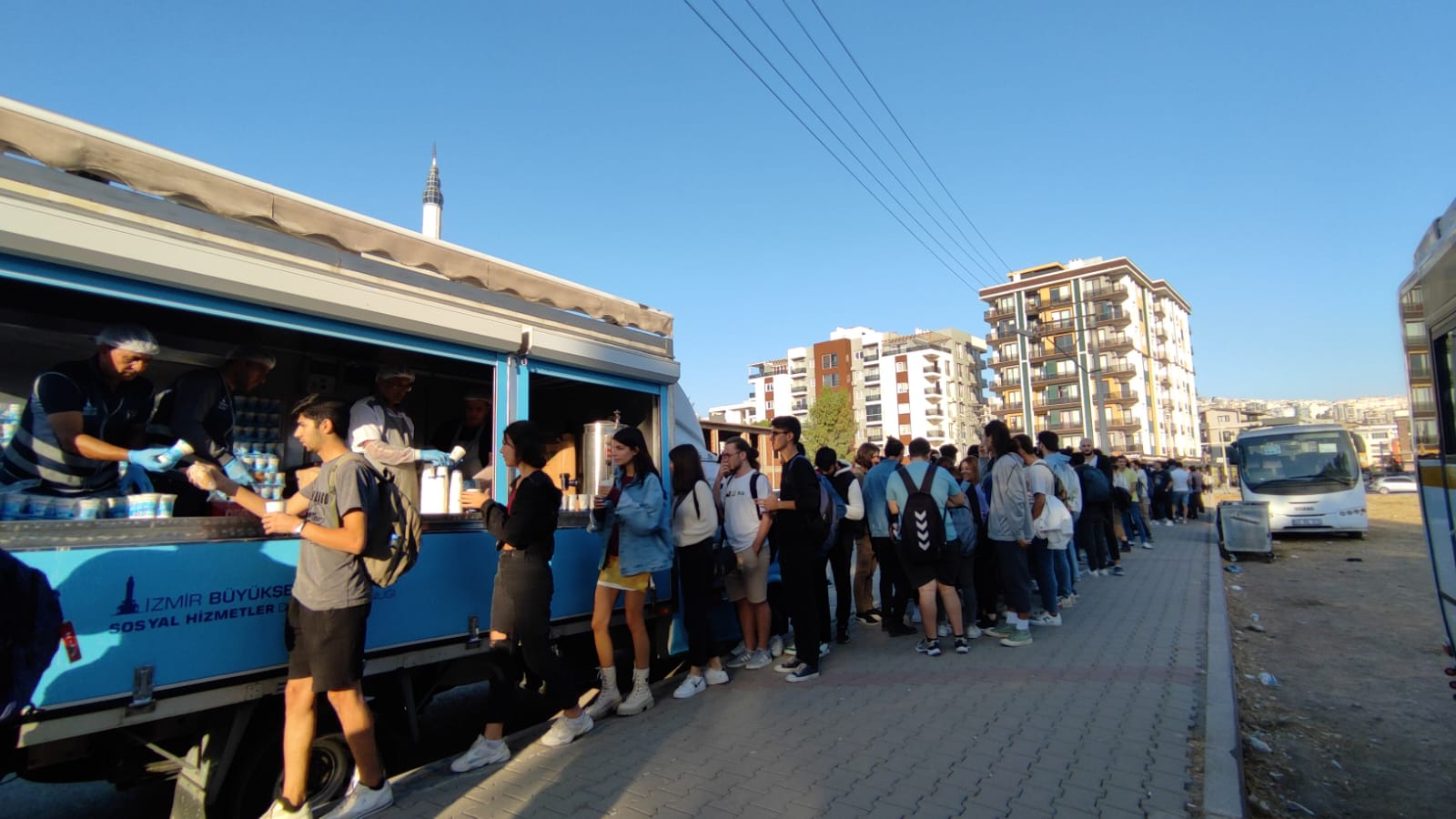 Yapılan yemek dağıtım uygulamasına dair memnun olduklarını belirten öğrenciler ayrıca İzmir Büyükşehir Belediye Başkanı Tunç Soyer’e tatlı ricasında bulunarak, “Bizim içeriye alınmamız lazım. Kapışmadan biz mağdur oluyoruz. Bir de Tunç Başkanımıza ricamız tatlı servisi olsun. Yemeklerimiz dört dörtlük, tatlı olsa bu da pastanın çileği olur. Yemeklerin malzemeleri çok cömert nitelik olarak. Öğrenciyi düşünüyorlar, sene sonuna kadar devam etsinler” ifadelerini kullandılar.