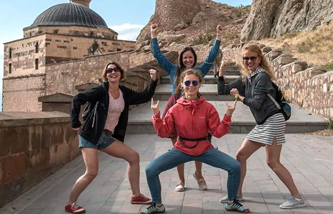 Ukraynalı dağcı kadınlar, daha sonra Doğubayazıt ilçe merkezindeki İshak Paşa Sarayı'nda ise günlük kıyafetleri ile fotoğraf çektirdi.(haberler.com)