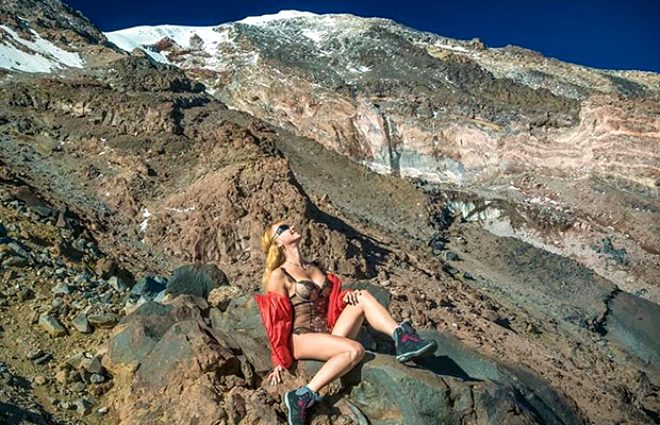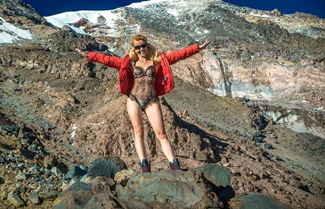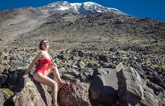 Ukraynalı turistler, deniz seviyesinden 5 bin 137 metre yüksekliği ile Türkiye'nin en yüksek dağı olma özelliğini taşıyan, efsaneleri ve türküleri ile ünlü, kar ve sis eksik olmayan Ağrı Dağı'nın 3 bin 200 ana kamp ve 4 bin 200 üst kampta dağcı kıyafetlerini çıkarıp bikini ve mayolu poz verdi.