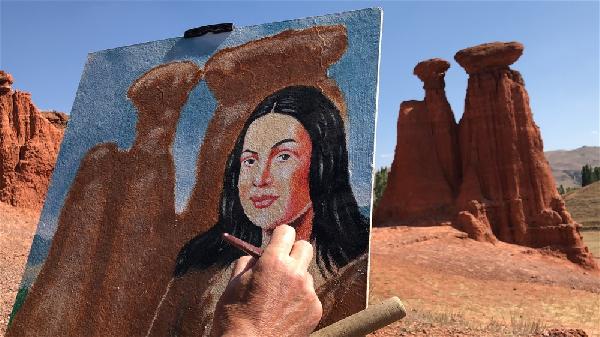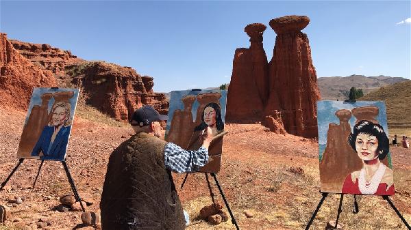 Turanoğlu, yaklaşık 6 ay süren çalışmasında ünlü isimleri peribacalarıyla birlikte tuvale işledi.