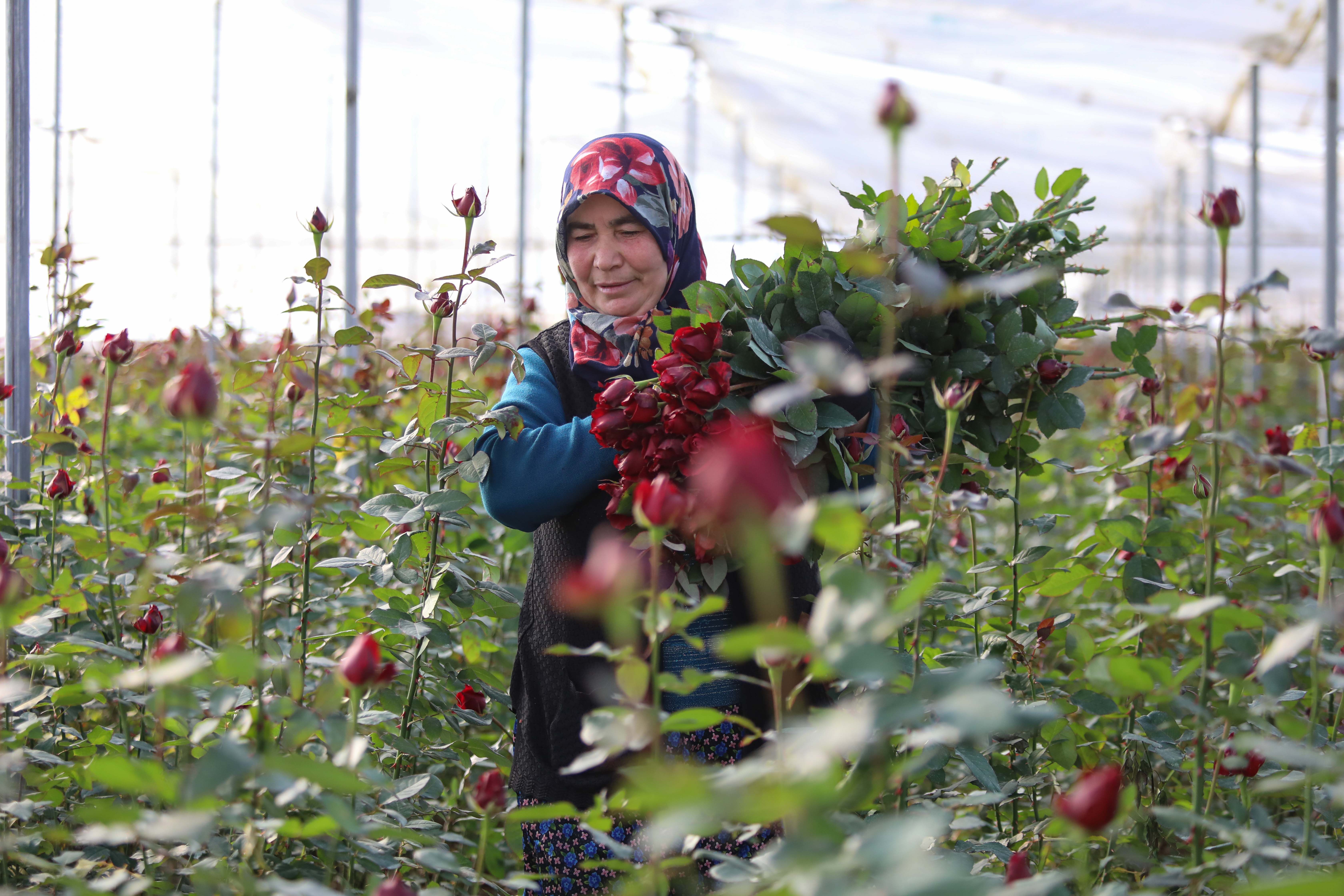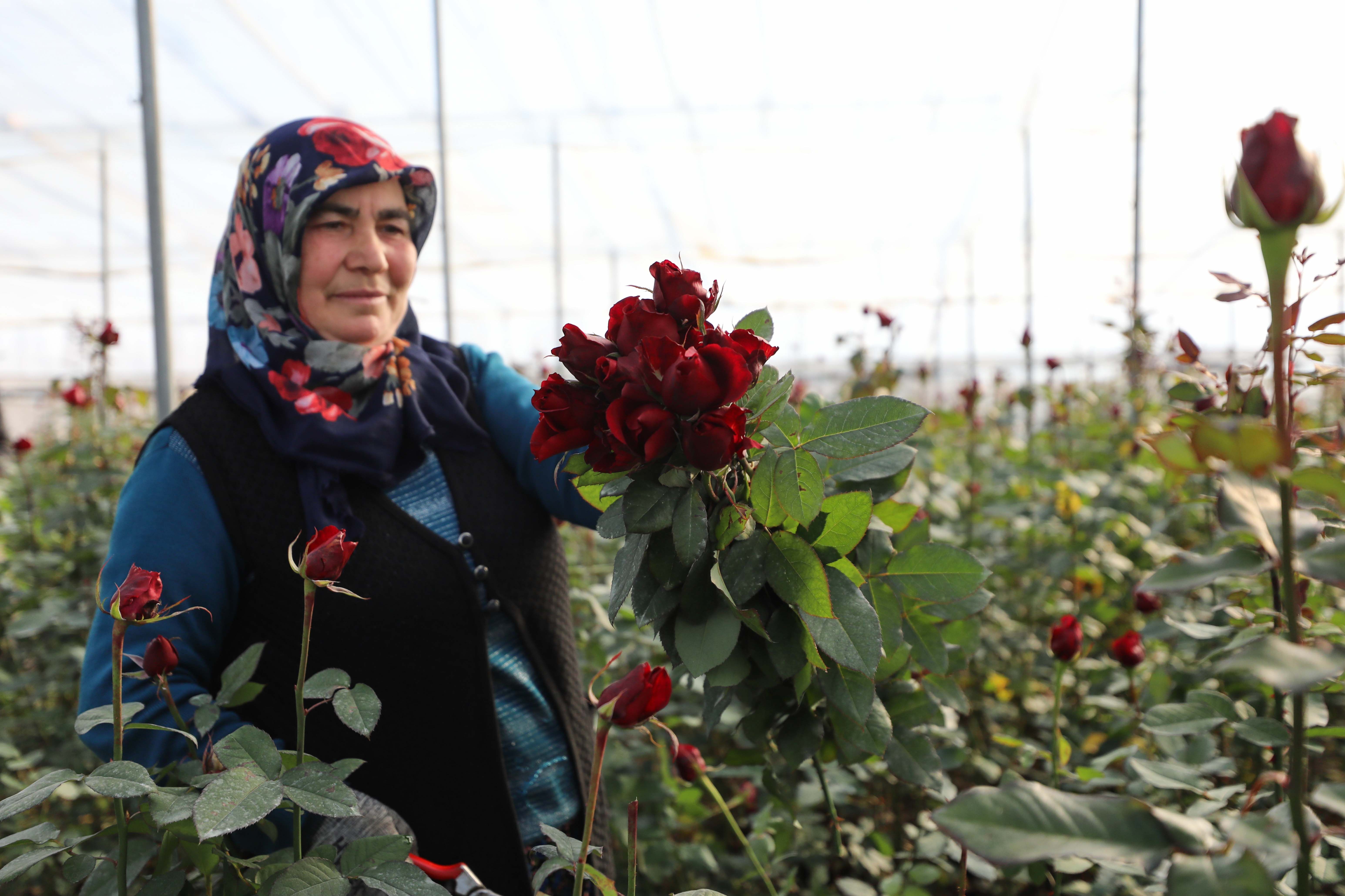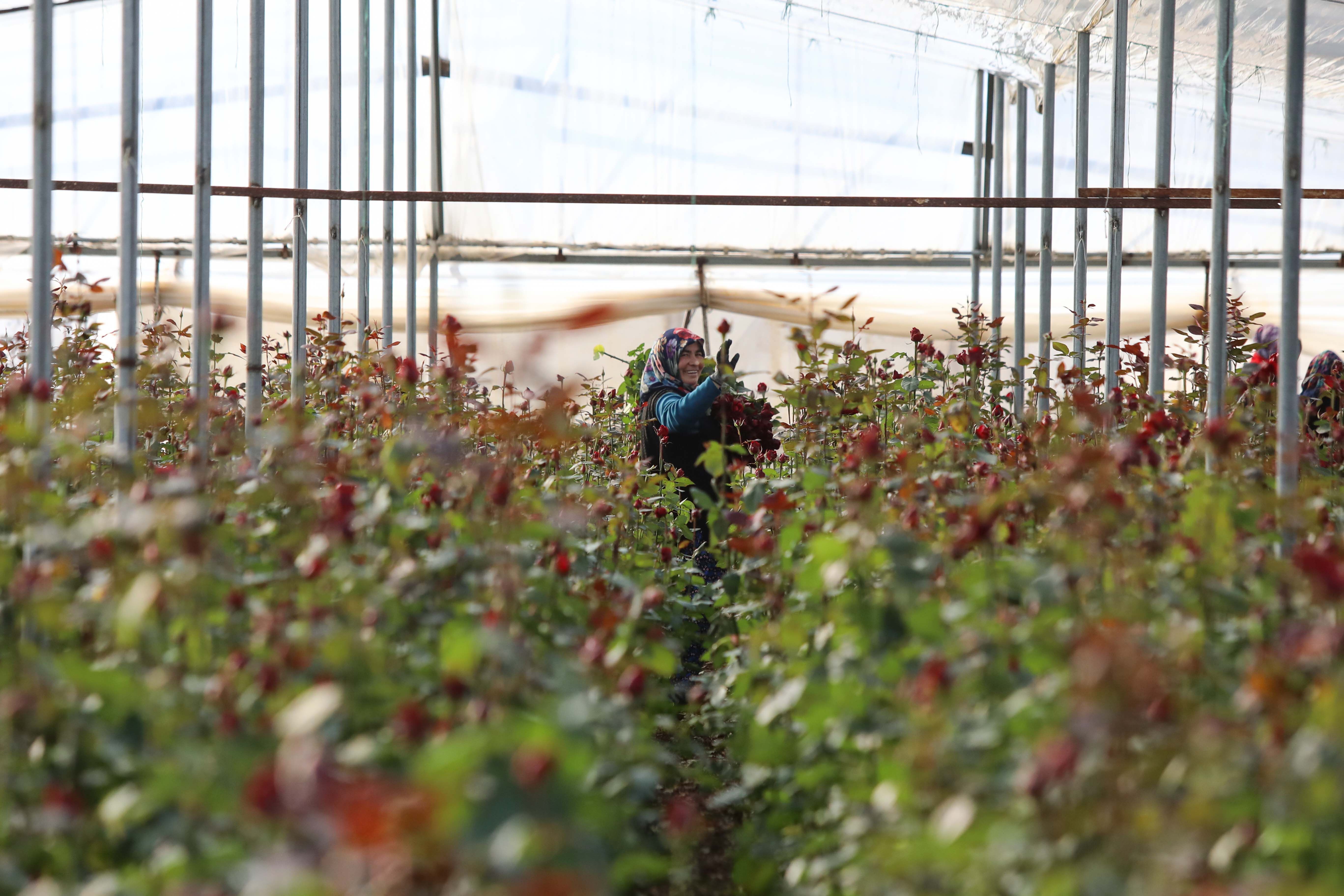 Menderes'te yaklaşık 800 dekarlık alanda örtü altı üretimle yılın her ayı gül yetiştiriliyor.