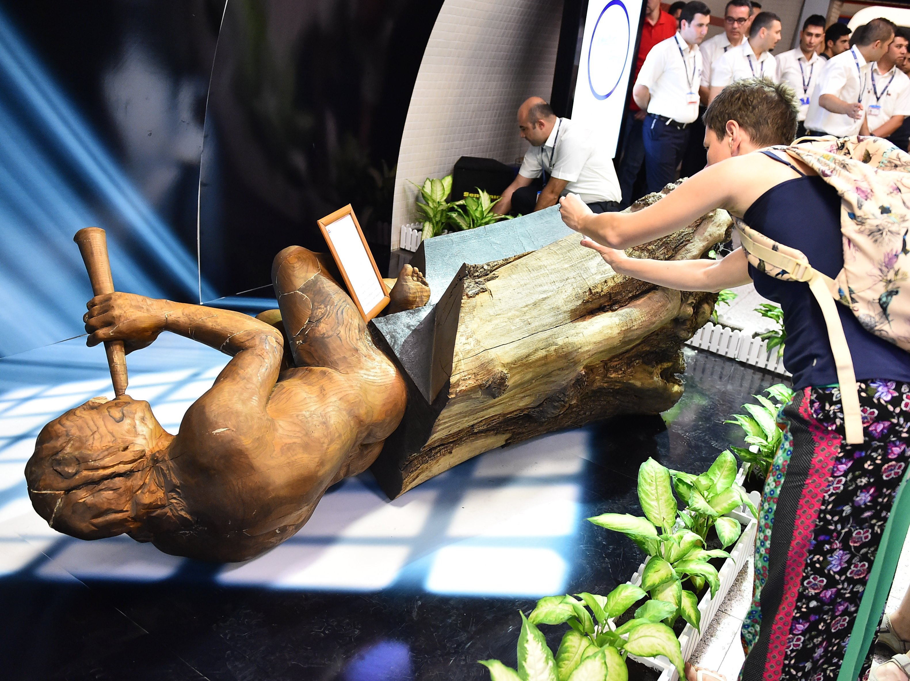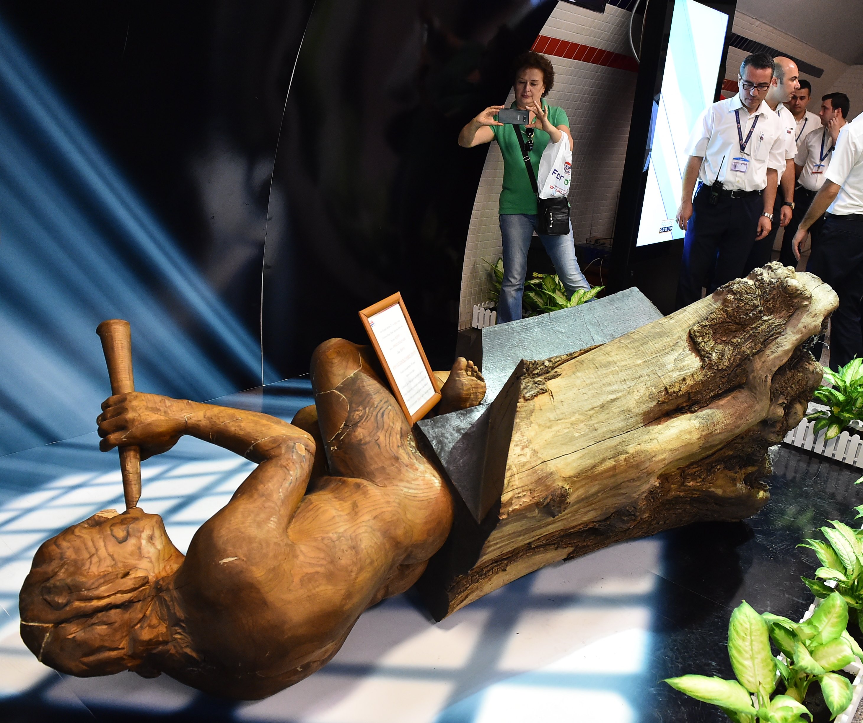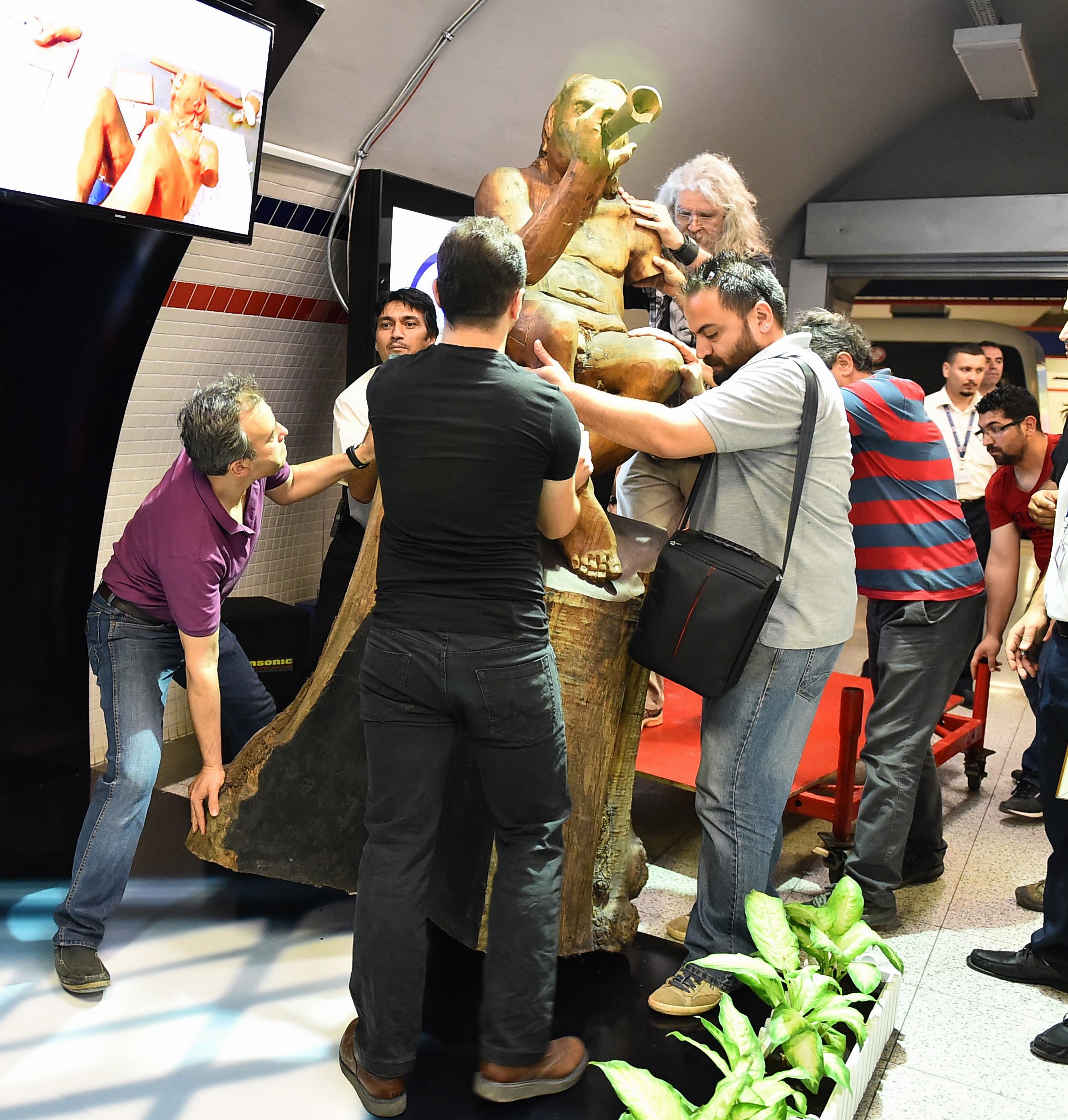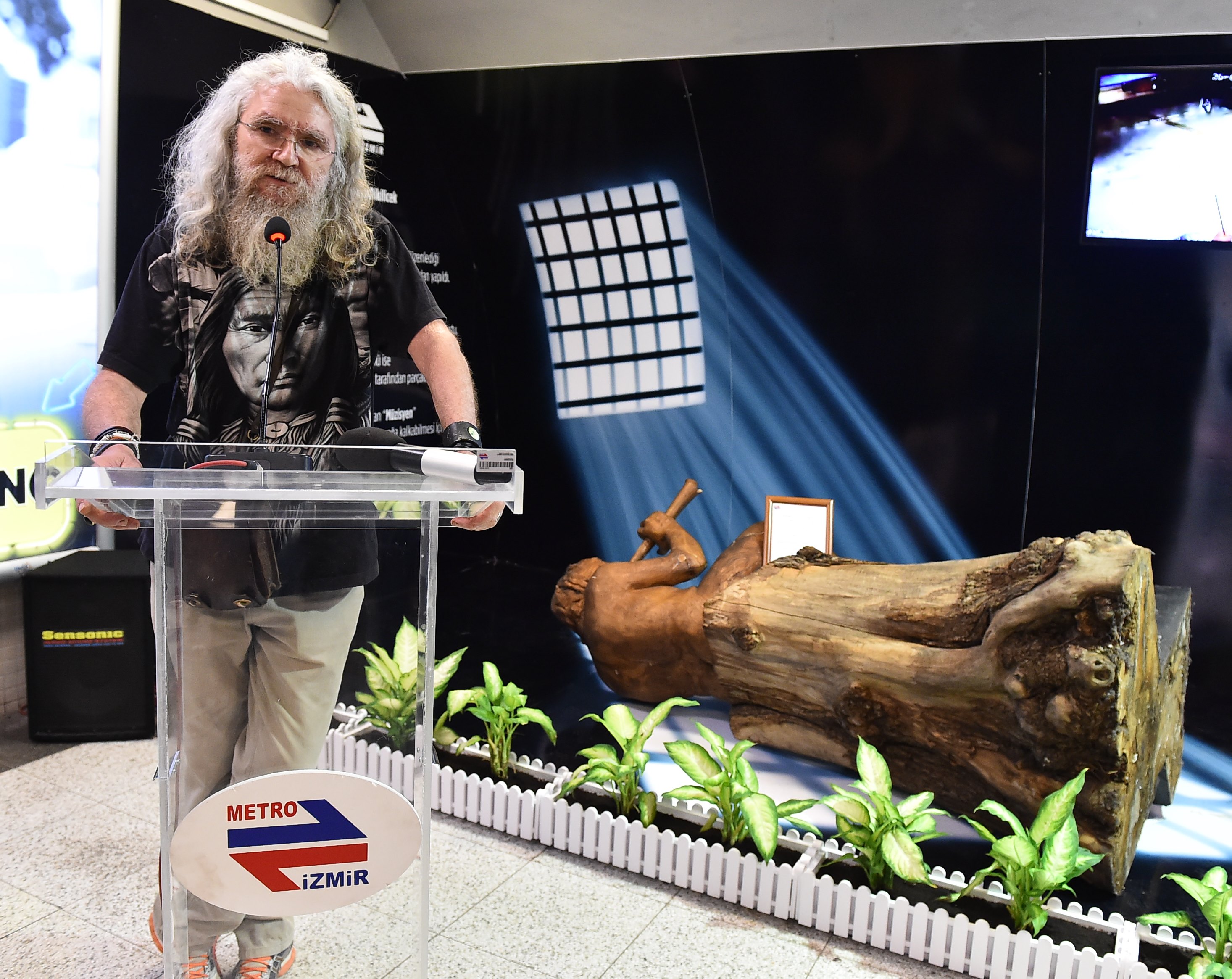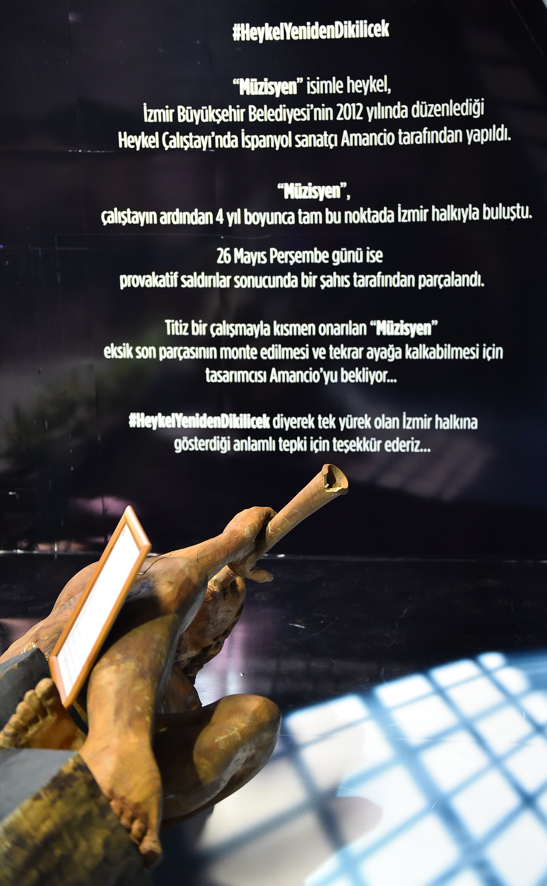 Geçtiğimiz günlerde İzmir Metrosu’nda sergilendiği alanda saldırıya uğrayarak tahrip olan ‘Müzisyen’ adlı ahşap heykel, kısmen onarılarak yerli ve yabancı heyteltraşlar tarafından eski yerine yerleştirildi. Heykelin eksik kalan son parçasını, eserin sahibi İspanyol heykeltıraş Andres Eylül ayında İzmir’e gelerek tamamlayacak.