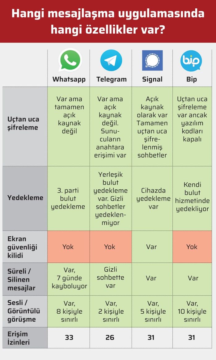 Hal böyle olunca bu platformlarda paylaştıklarımızın, paylaştığımız kişilerle aramızda kalıp kalmadığı, diğer bir ifadeyle gizlilik kritik öneme sahip. Bunun için da “uçtan uca şifreleme” denilen bir teknoloji kullanılıyor. Mesajı gönderen cihaz tarafından, yalnızca alıcı cihazda çözülebilecek şekilde şifrelenmesi yöntemi olan bu teknolojide, mesaj, göndericiden alıcıya şifrelenmiş biçimde gidiyor. Ve WhatsApp, Telegram, Signal ve BiP’te bu teknoloji temel olarak var. Ancak hangisinin hangi uçtan uca şifreleme metodunu kullandığı çok ne değil.
