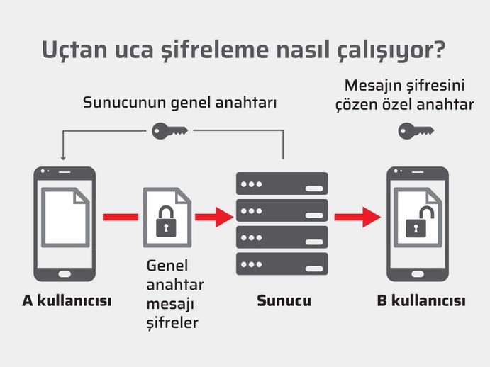 Uçtan uca şifreleme özelliği, gönderilen içeriklerin yalnızca siz ve iletişim kurduğunuz kişi tarafından okunabilmesini veya dinlenebilmesini sağlıyor. Böylece uygulamayı sunan taraf (WhatsApp, Telegram ve diğerleri…) dahil olmak üzere aradaki hiçbir taraf gönderilen içerikleri okuyamıyor veya dinleyemiyor. Bunun nedeni, uçtan uca şifreleme özelliğinin mesajlarınızı bir kilitle güvence altına alması ve kilidi açıp mesajları okuyabilmek için gereken özel anahtarın yalnızca mesajlarınızın alıcısında ve sizde bulunmasından kaynaklanıyor.