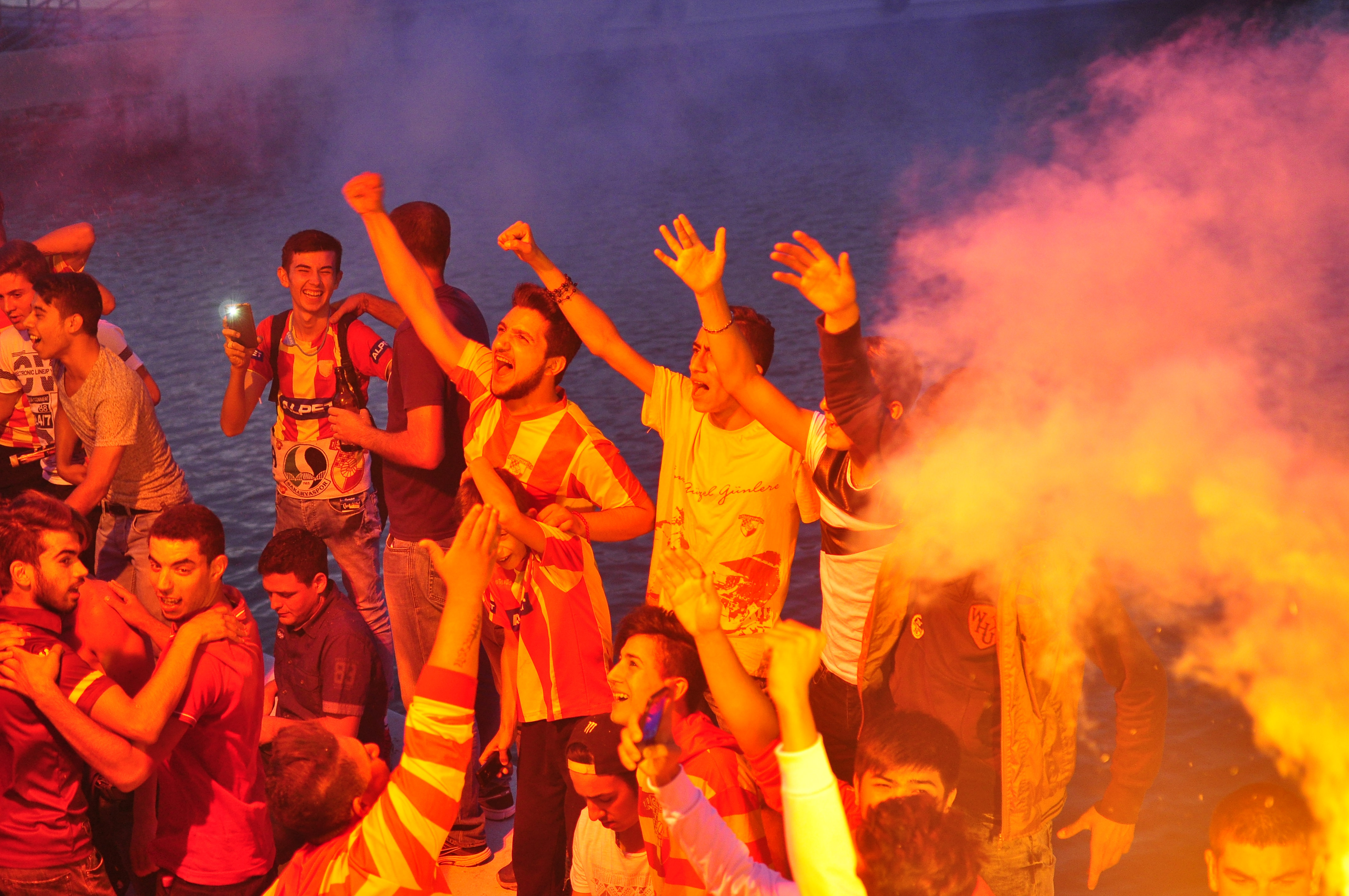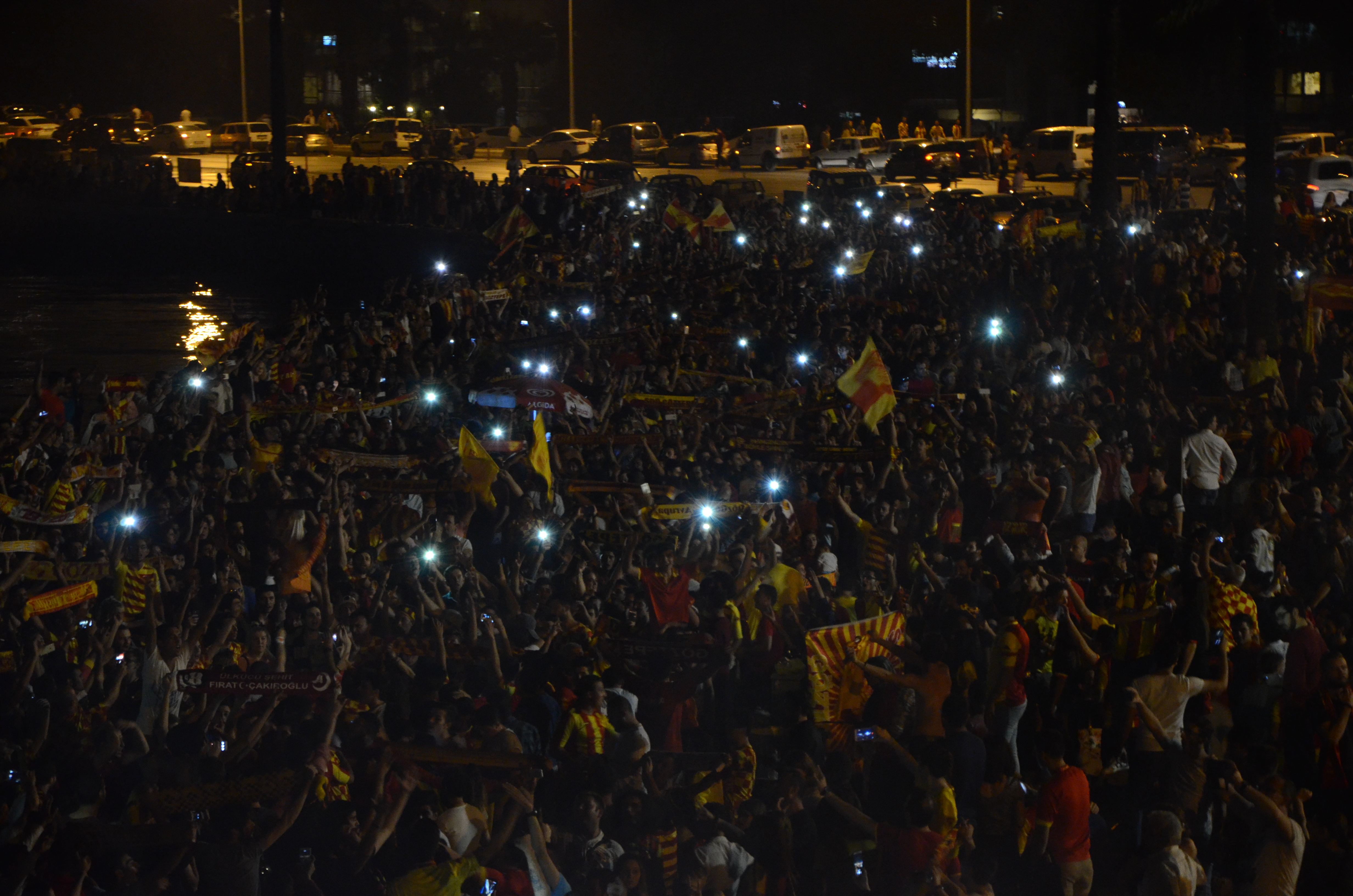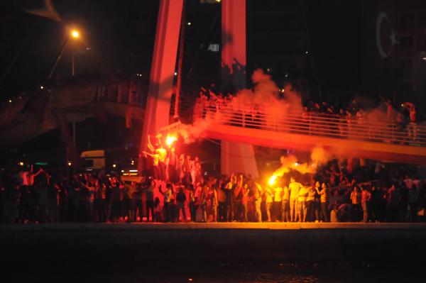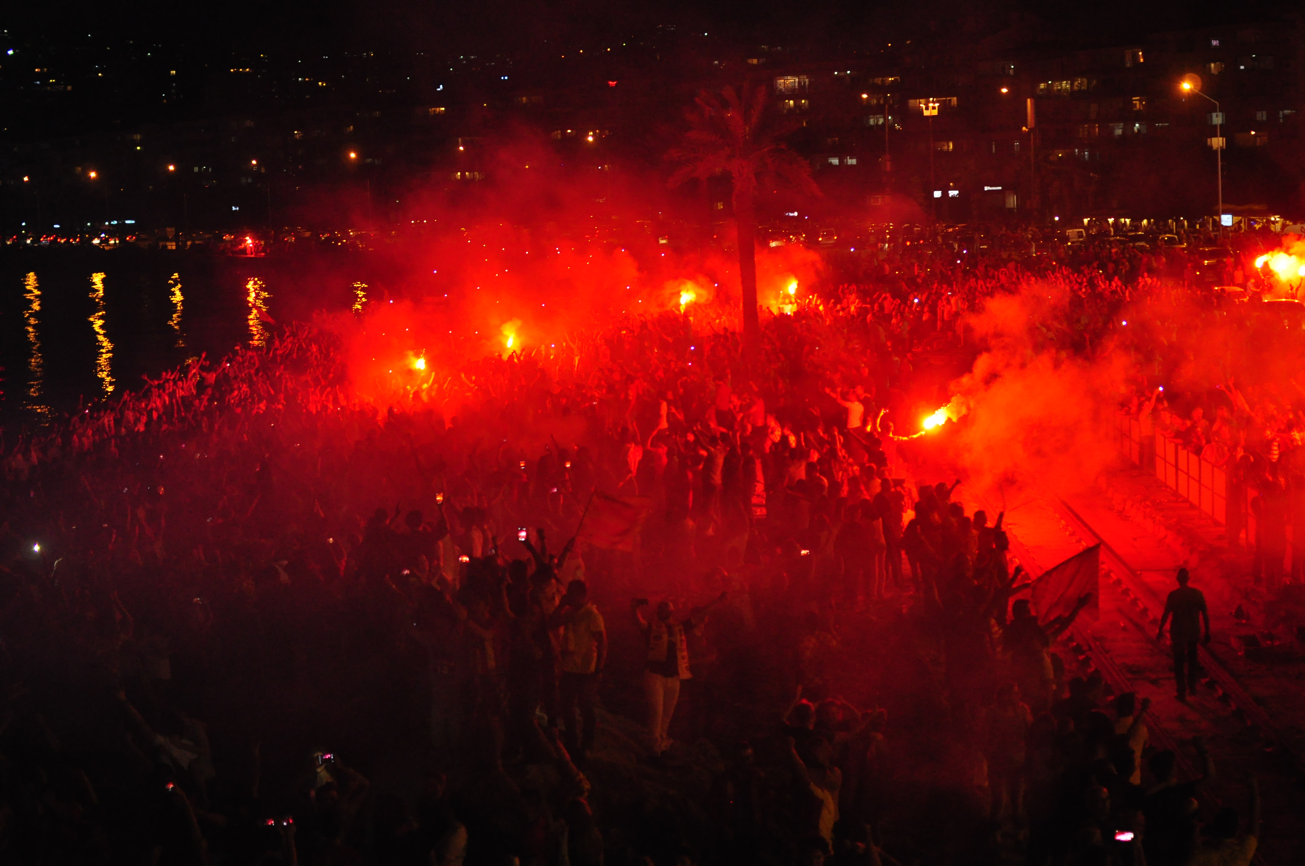 Sarı-kırmızılı taraftarlar Güzelyalı semtinde saat 19.25’te toplanarak lazer ve dj gösterileriyle kutlamalara başlarken, Mustafa Kemal Sahil Bulvarı’nda özel ritim dans grubu da coşkuyu ikiye katladı. (dha) - Fotoğraflar: Can KAPLAN