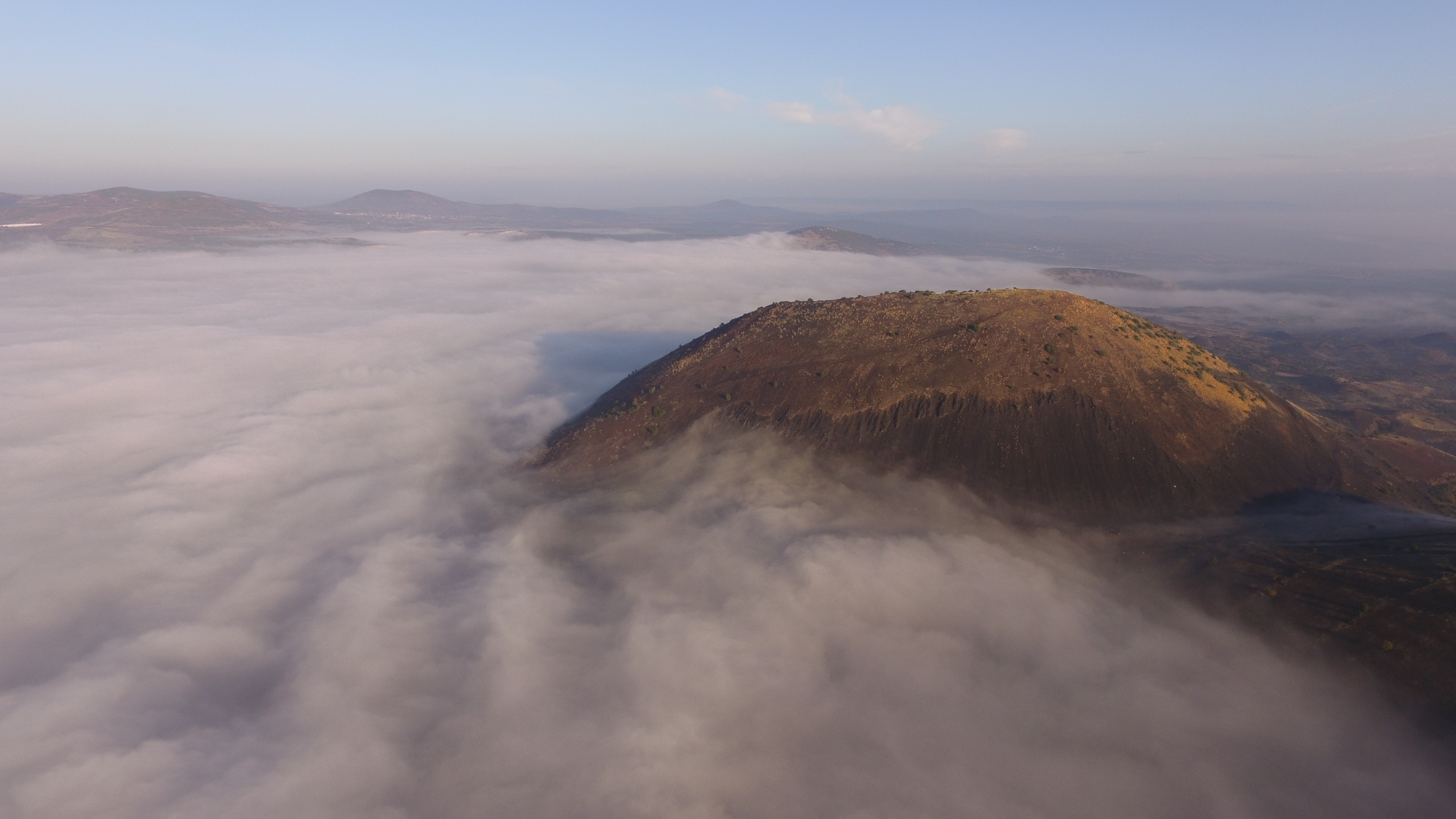 UNESCO'nun Global Jeopark Ağı'nda yer alan parkta da 12 bin yıl önce patlayan volkanlar nedeniyle lav akıntıları sonucu oluşan bazalt kayalar ve volkan konilerinin zirveleri, sis bulutlarının arasından drone kamerasına yansıdı.