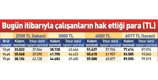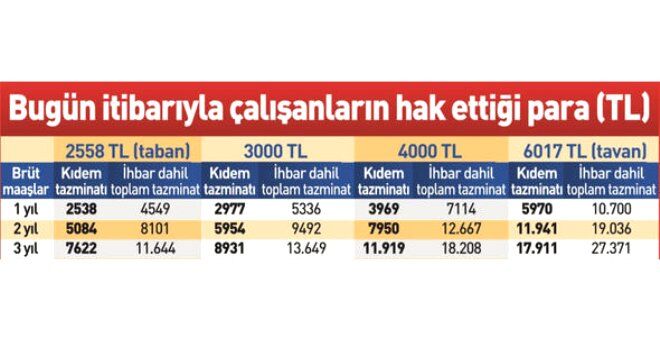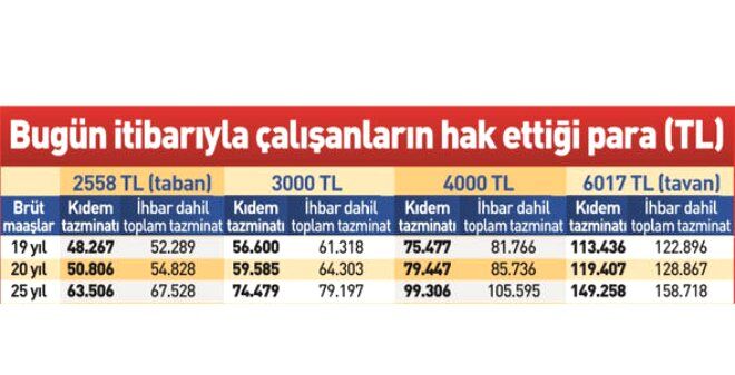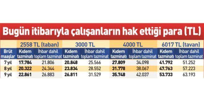 Kıdem tazminatının tavan tutarı memur maaş kat sayısına, taban tutarı ise asgari ücret artışına endeksli.1 Ocak itibarıyla taban tutar brüt asgari ücret olan 2558 liraya çıktı. Yani 2018'e göre 525 liralık artış oldu.Tavan tutar ise 5434 liradan 6017 liraya yükselmiş oldu. Brüt maaşınız 7 bin lira, 10 bin lira ya da 20 bin lira olsa dahi kıdem tazminatı hesabında her yıl için en fazla 6017 lira baz alınacak.
