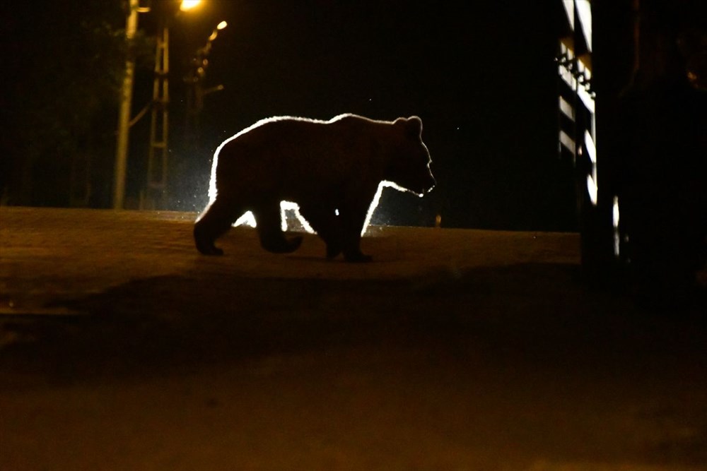 Kars'ın Sarıkamış ilçesinde ormanlık alanda yiyecek bulmakta zorlanan bozayılar, yerleşim yerlerine inerek çöp konteynerlerinden besleniyor.