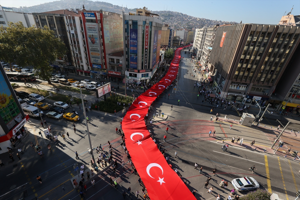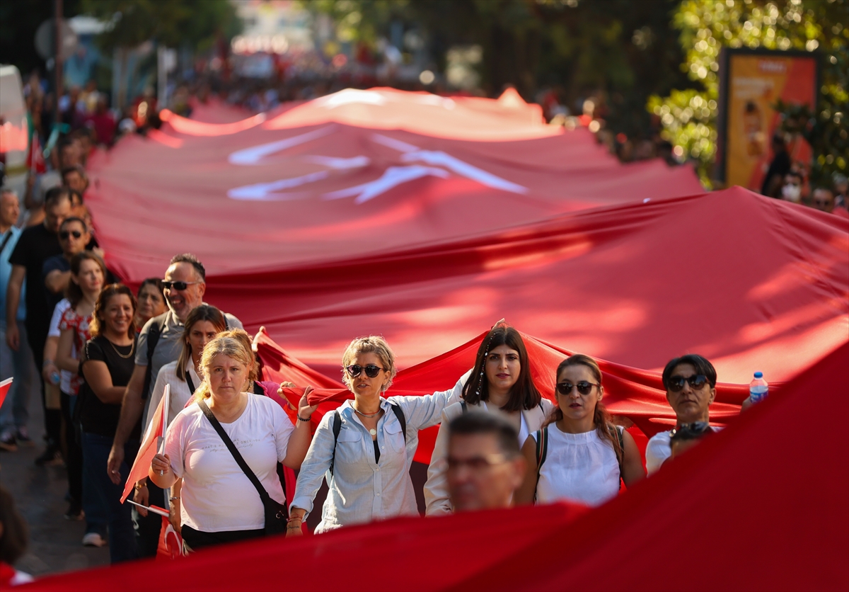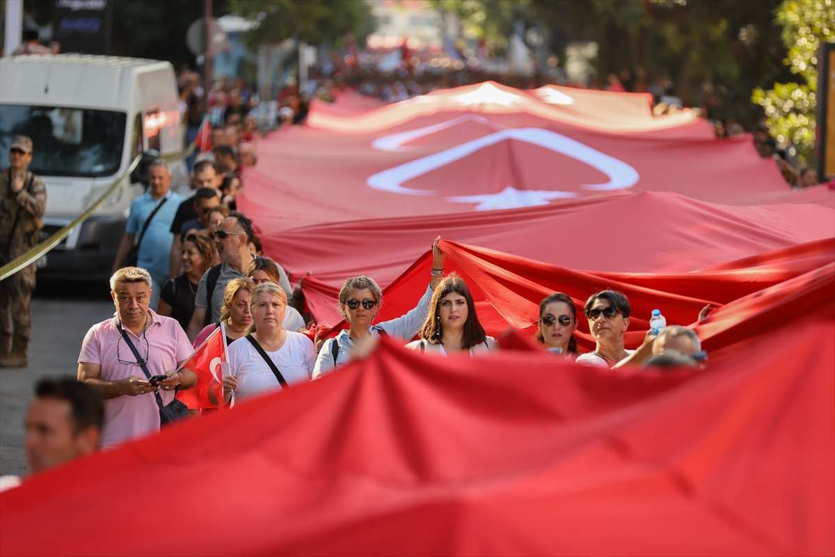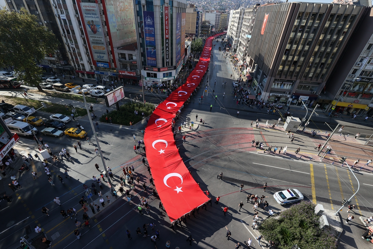 Türk ordusunun 100 yıl önce bugün İzmir'e girerken kullandığı tarihi güzergah üzerinde düzenlenen yürüyüşte Gaziler, Anafartalar ve İkiçeşmelik caddelerini takip eden İzmirliler, 350 metre uzunluğundaki dev Türk bayrağını birlikte taşıdı.