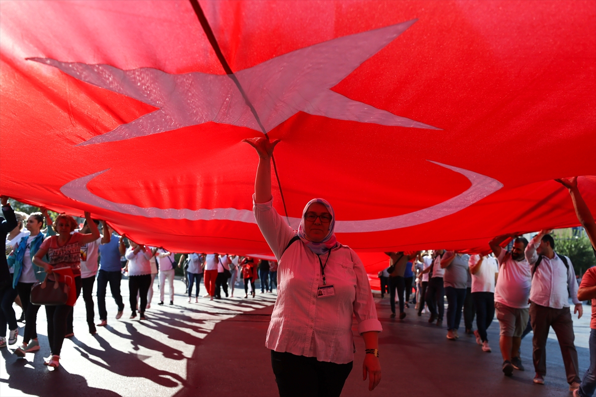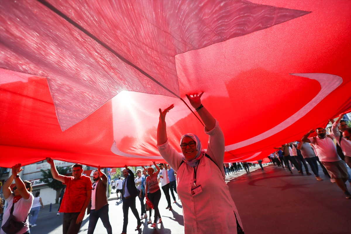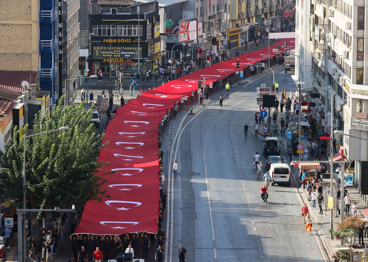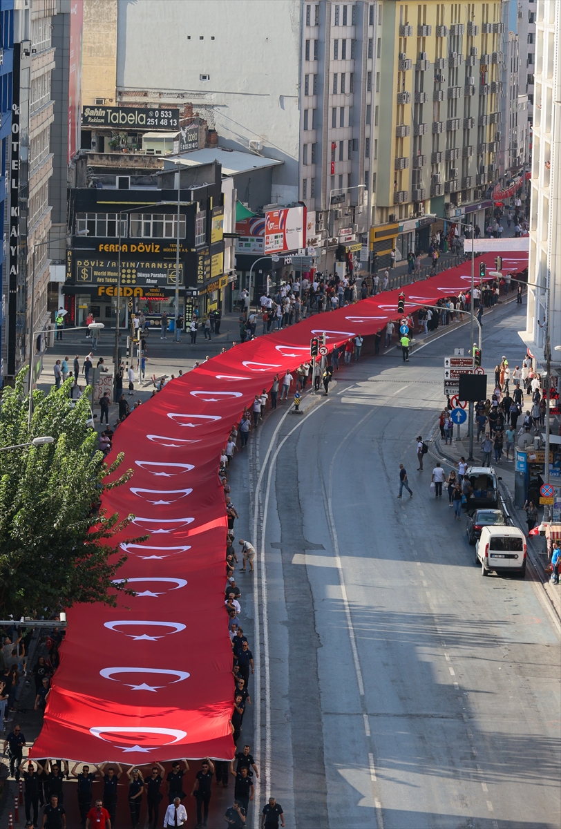 Türk ordusunun 100 yıl önce bugün İzmir'e girerken kullandığı tarihi güzergah üzerinde düzenlenen yürüyüşte Gaziler, Anafartalar ve İkiçeşmelik caddelerini takip eden İzmirliler, 350 metre uzunluğundaki dev Türk bayrağını birlikte taşıdı.