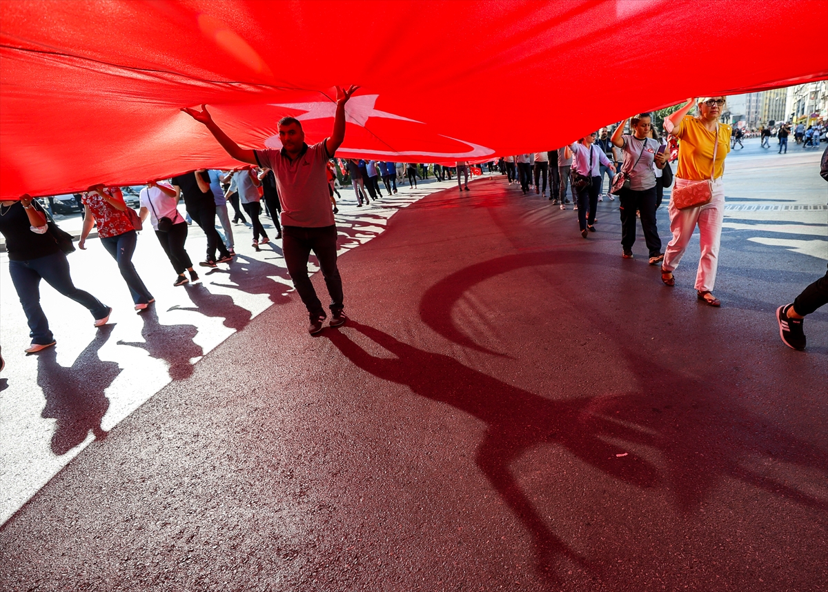 Ellerinde Türk bayraklarıyla yürüyenlere çevredeki vatandaşlar da alkışlarla destek verdi.