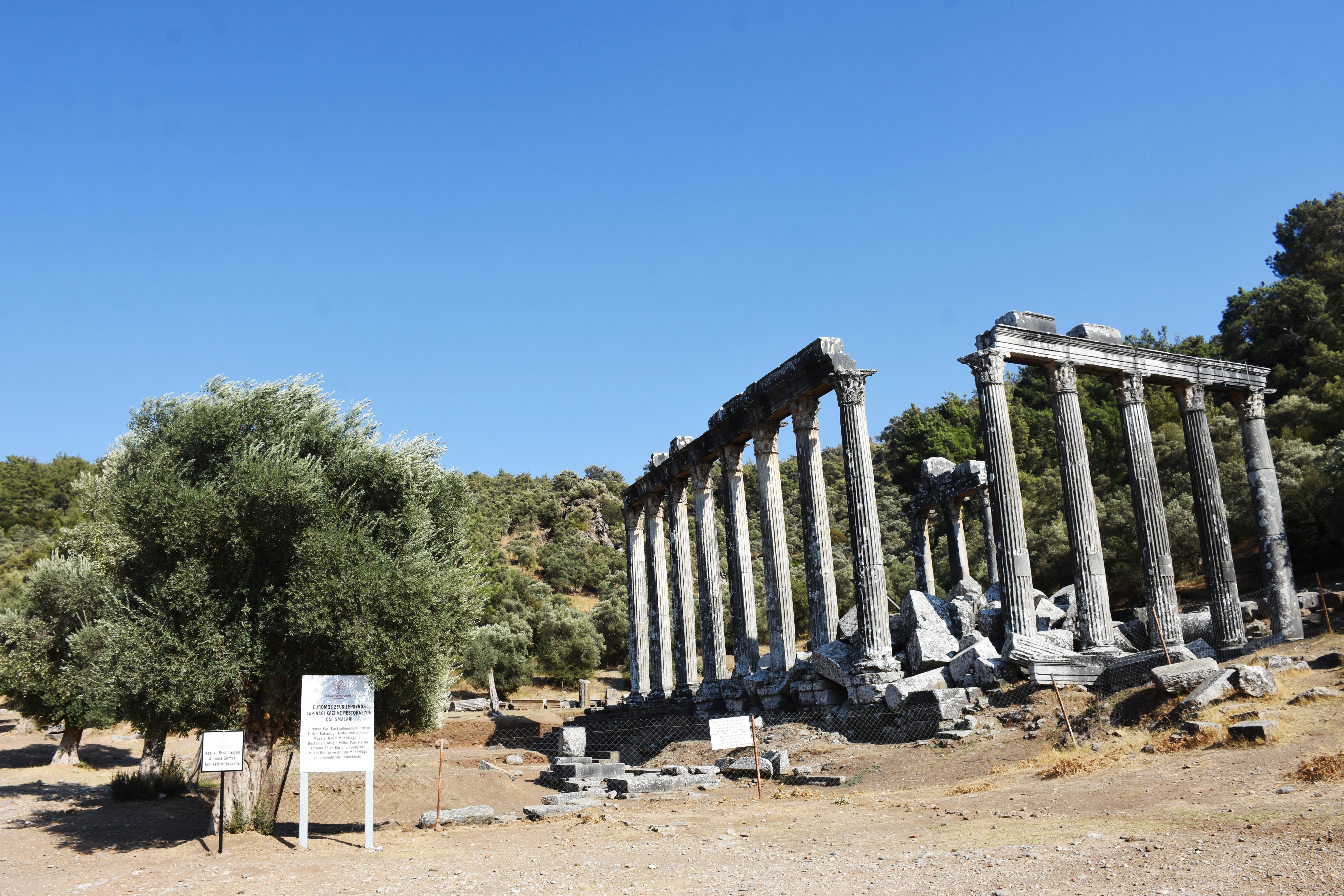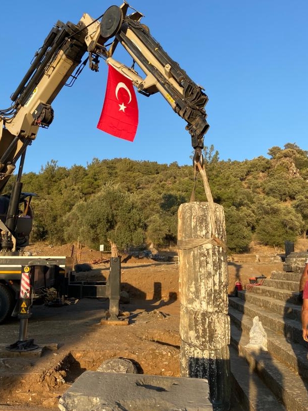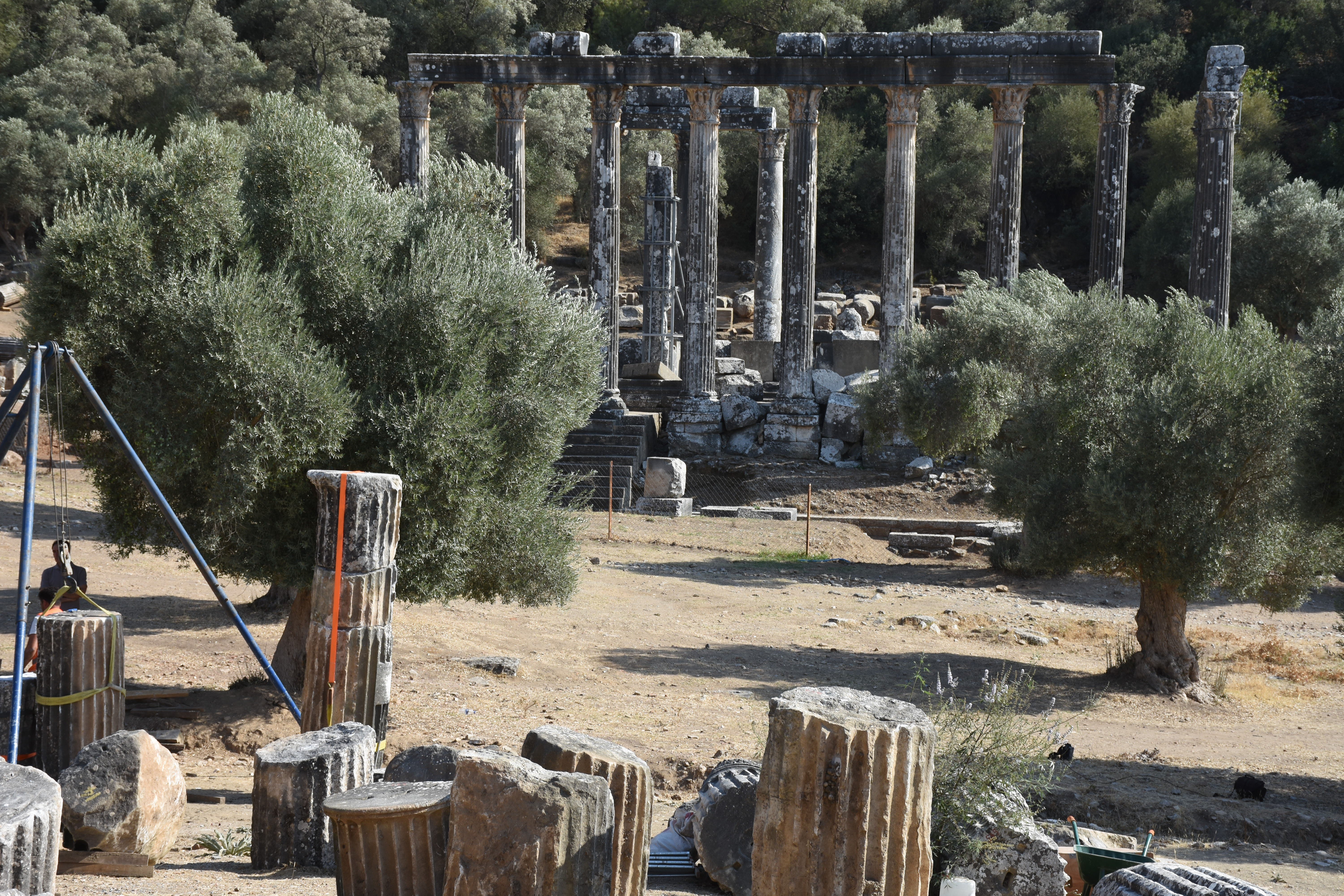 Muğla'nın Milas ilçesindeki Euromos Antik Kenti'nde bulunan 1860 yıllık Zeus Lepsynos Tapınağı'nın zamana yenik düşmüş sütunlarının yeniden yükselmesi için çalışma yürütülüyor.