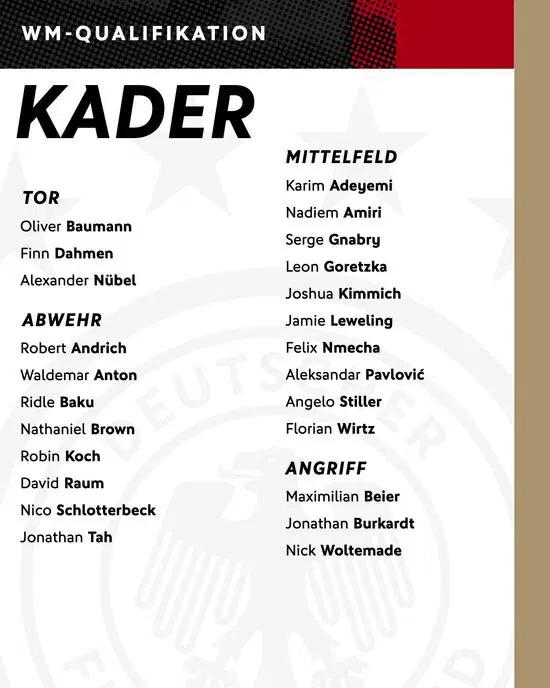 Bu maçlar öncesinde Almanya Milli Takımı'nın aday kadrosu açıklandı. Açıklanan kadroda Galatasaraylı Leroy Sane yer almadı. Sane, bir önceki milli arada oynanan maçlarda da kadroda yer almamıştı.