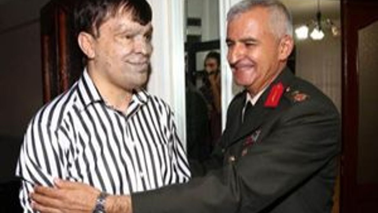 Siirt'te terör örgütünün kurduğu mayının patlaması sonucu gözleri ve ellerini kaybeden Gazi Jandarma Binbaşı Mehmet Bedri Aluçlu ve eşi İclal Aluçlu, çocukları 10 yaşındaki Hakan ve 4 yaşındaki Okan Aluçlu, Tuğgeneral Büyükcercan ve eşi Necla Büyükceran'ı kapıda karşıladı.