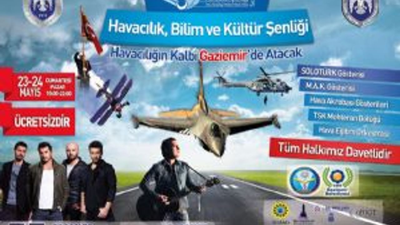 Hava Astsubay Meslek Yüksek Okulu ile Gaziemir Belediyesi'nin ortaklaşa düzenlediği, İzmir Büyükşehir Belediyesi, İZSİAD, Bil Okulları, Gençiz Fuarcılık ve Organizasyon'un destek verdiği 3 günlük Havacılık, Bilim ve Kültür Şenliği bugün başlıyor. Askeri alanda yapılan halka açık ilk ve en büyük etkinlik olma özelliğini taşıyan ve üç gün sürecek şenlikte, renkli hava gösterileri, yarışmalar ve konserler düzenlenecek. Gaziemir'deki Hava Teknik Okulları Komutanlığı yerleşkesinde düzenlenecek şenlikte Solotürk uçuşu, Ali İsmet Öztürk'ün hava akrobasisi, paraşüt atlayışı, model uçak ve uçuşları, hava arama kurtarma gösterisi gibi uçuş aktiviteleri yer alacak. Hava Eğitim Komutanlığı Bandosu'nun konser vereceği şenlikte; 23 Mayıs Cumartesi günü Grup Kolpa ve 24 Mayıs Pazar günü Kıraç sahne alacak. Sanatçılar konserleri ile İzmirlilere unutulmaz anlar yaşatacak. Gaziemir Belediyesi Halk Oyunları Ekibi de şenlik alanında özel bir gösteri yapacak.