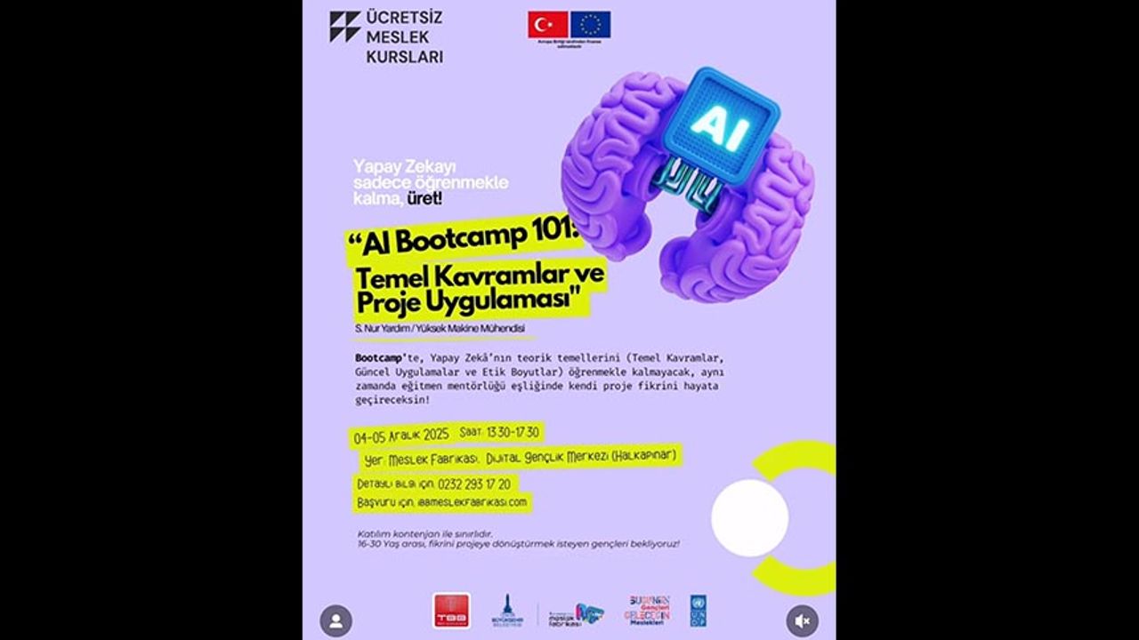 İzmir Büyükşehir Belediyesi Meslek Fabrikası Şube Müdürlüğü, gençlerin dijital yetkinliklerini arttırmak amacıyla önemli bir eğitim programını daha hayata geçiriyor. Avrupa Birliği (AB) tarafından finanse edilen, Türkiye Belediyeler Birliği’nin (TBB) nihai faydalanıcı ve Birleşmiş Milletler Kalkınma Programı’nın (UNDP) uygulayıcı olduğu "Bugünün Gençleri Geleceğin Meslekleri Projesi" kapsamında, "AI Bootcamp 101: Temel Kavramlar ve Proje Uygulaması" eğitimi 4-5 Aralık tarihlerinde düzenlenecek.