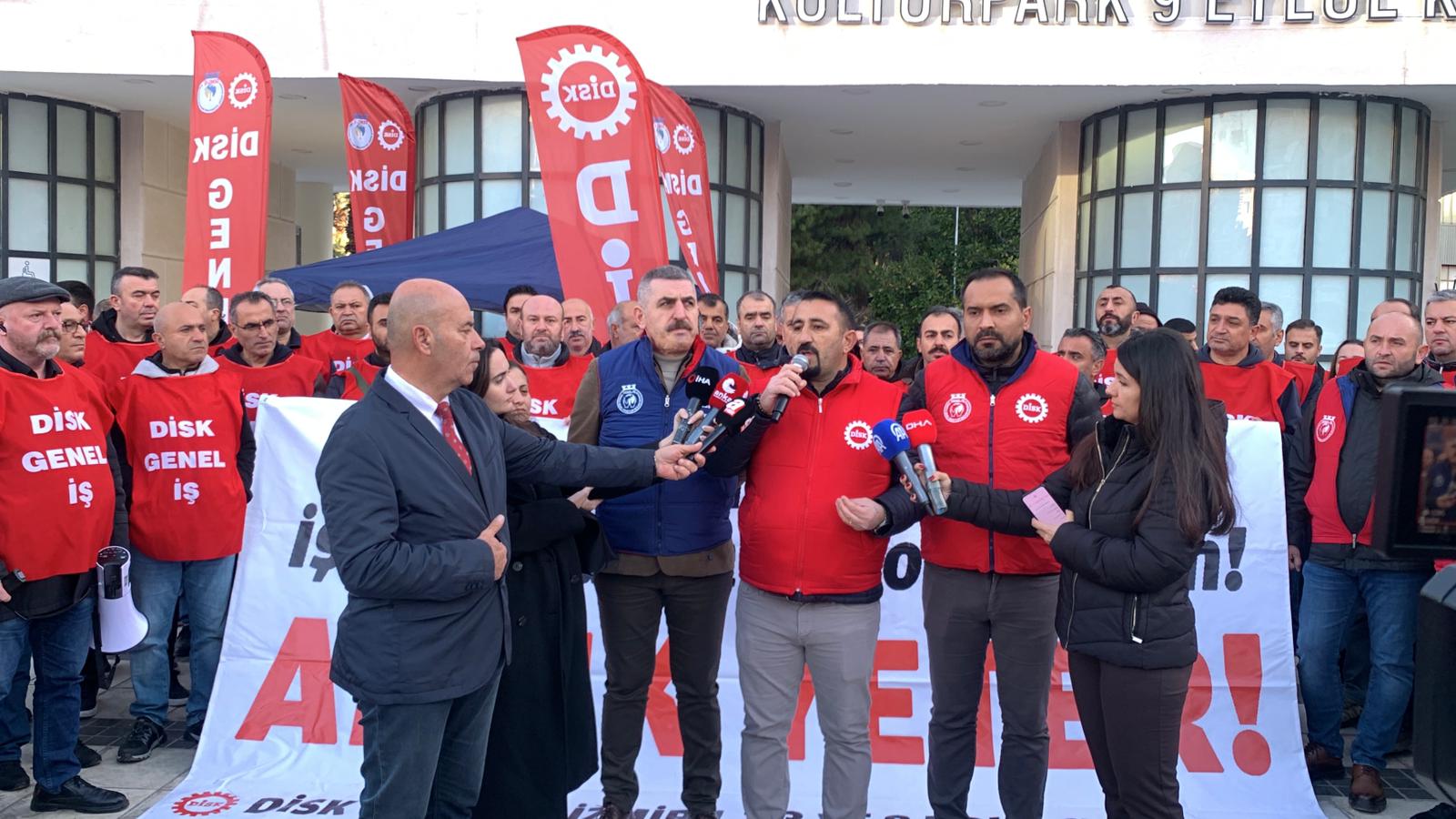 İşçiler ve sendika adına basın açıklamasını Genel-İş İzmir 2 No’lu Şube Başkanı Ercan Gül okudu. Gül, basın açıklamasına, “Dün burada binlerce emekçi arkadaşlarımızla birlikte maaşlarımızın eksik yatırılması, dört aydır sosyal haklarımızdaki ödemelerin düzenli bir şekilde ödenmemesi ve 350 tane arkadaşımızın şirkete iade edilip işbaşı yaptırılmamasından kaynaklı sesimizi duyurmak için bu alandaydık. Bugün de burada şirkete iade olan arkadaşlarımızla beraber işbaşı yaptırılması ve sesimizi yükseltmek için buradayız. Biz dün buradan çağrıda bulunduk, gelin bir an önce masayı kuralım ve mağduriyet kaldırılsın. Şu dakikaya kadar sesimizi duyan olmadı. Gece gündüz demeden bu müzakereye açığız” ifadeleriyle başladı.