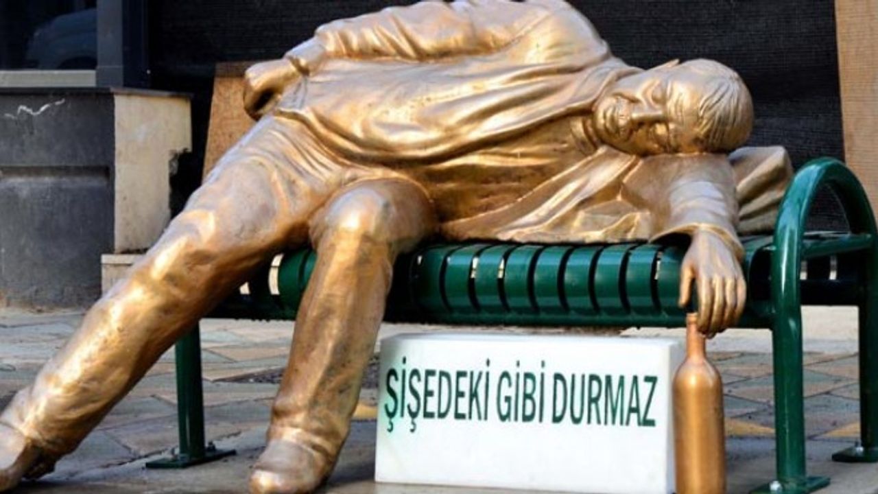 'Şişede durduğu gibi durmaz' yazılı, yanında içki şişesi bulunan, bank üzerinde sızmış adam heykeli, eğlence mekanlarının yer aldığı Hoşnudiye Mahallesi'nde, 'Barlar Sokağı' olarak adlandırılan Vural Sokak girişine konuldu.