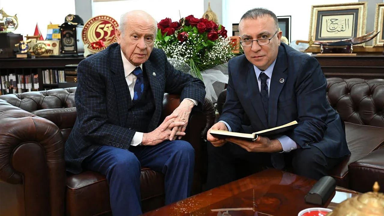 Bahçeli ile birlikte kara kaplı bir defteri inceledikleri fotoğrafı paylaşan Yönter, "Allah başımızdan eksik etmesin inşallah…" notunu düştü.