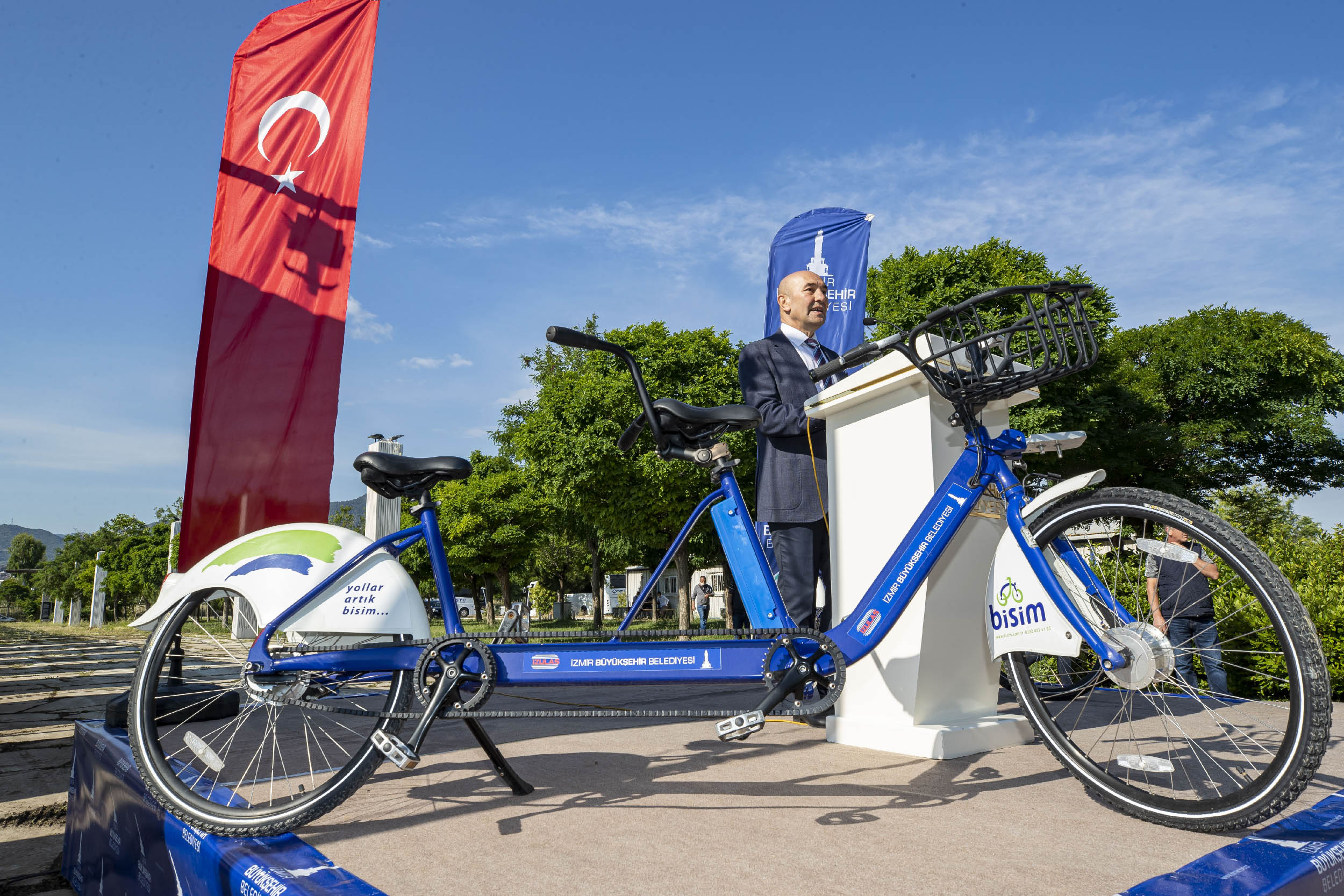 İzmir Büyükşehir Belediyesi iki sürücülü (tandem) bisikletleri, 3 Haziran Dünya Bisiklet Günü'nde törenle Bisim Akıllı Bisiklet Kiralama Sistemi'ne dahil etti. Küresel salgının ardından yaşanan normalleşme sürecinde bisiklet kullanımını teşvik etmek için 70 tandem bisiklet hizmete alındı. İzmir Büyükşehir Belediye Başkanı Tunç Soyer 'Tandem bisikletler hem vatandaşlarımıza keyifli bir bisiklet deneyimi yaşatacak hem de görme engelli vatandaşlarımızın erişilebilir ve engelsiz bir şekilde yaşama dahil olmasına katkı sağlayacak. Türkiye'de ilk kez bir belediye, görme engelli vatandaşlarımızın da bisiklet keyfi yaşaması için böyle bir hizmete imza atıyor' dedi. Soyer, takım arkadaşı görme engelli bir vatandaşla tandem bisiklet kullandı.