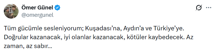 Soruşturma kapsamında gözaltına alınan Günel, sosyal medya hesabı üzerinden yaptığı açıklamada, “Tüm gücümle sesleniyorum; Kuşadası’na, Aydın’a ve Türkiye’ye. Doğrular kazanacak, iyi olanlar kazanacak, kötüler kaybedecek. Az zaman, az sabır…” ifadelerini kullandı.