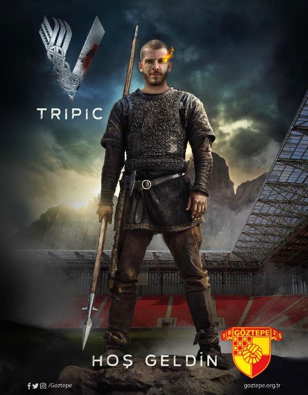 Göztepe, sosyal medya hesabından yeni transfer Tripic'i Viking kıyafetiyle tanıtırken, paylaşılan fotoğrafta yeni stat Gürsel Aksel Spor ve Sağlıklı Yaşam Merkezi'nin de görseli kullanıldı. (DHA)