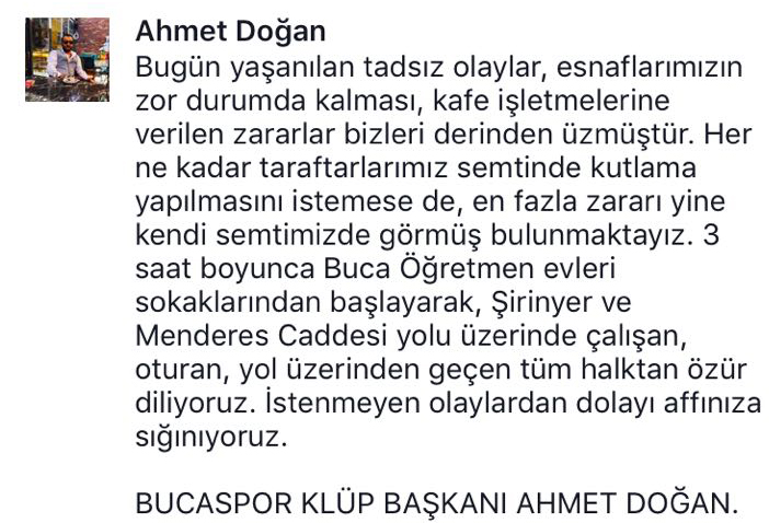 Bucaspor Kulüp Başkanı Ahmet Doğan sosyal medyadan olayla ilgili paylaştığı mesajında, 'Bugün yaşanılan tatsız olaylar, esnaflarımızın zor durumda kalması, kafe işletmelerine verilen zararla bizleri derinden üzmüştür. Her ne kadar taraftarlarımız semtinde kutlama yapılmasını istemese de, en fazla zararı yine kendi semtimizde görmüş bulunmaktayız. 3 saat boyunca Öğretmen evleri sokaklarından başlayarak, Şirinyer ve Menderes Caddesi üzerinde çalışan, oturan ve yol üzerinden geçen tüm halktan özür diliyoruz. İstenmeyen olaylardan dolayı affınıza sığınıyoruz' ifadelerini kullandı.