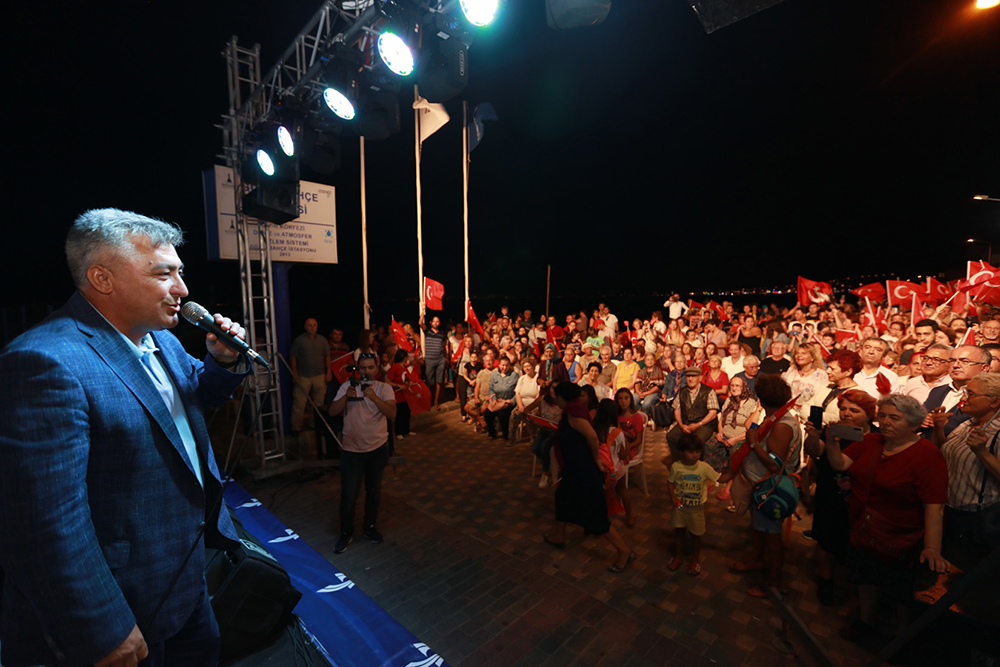 Yürüyüşün ardından gece pazarında buluşan Güzelbahçelileri havai fişekler karşıladı. Konser öncesi sahneye çıkan Güzelbahçe Belediye Başkanı Mustafa İnce, 'Bugün Zafer Bayramımızın 97.yılı. Bu onurlu şan ve şerefle dolu zaferi tüm halkımızla birlikte neşeyle ve coşkuyla kutluyoruz. Şehirler meydanlarıyla, ülkeler zaferleriyle anılır. Tek, ebedi ve ezeli Baş Komutanımız Gazi Mustafa Kemal Atatürk'ün önderliğinde başlayan kurtuluş mücadelemizin Cumhuriyetimizin, kuruluşumuzun, kurtuluşumuzun ve bağımsızlığımızın kazanılmasının en büyük günlerinden biridir 30 Ağustos Zafer Bayramı. Ama isteriz ki hep barışların, kardeşliklerin, el ele bütünleşerek, sosyal refah içerisinde huzurlu bayramlarda buluşalım. Bu kutlamaları her yıl coşkuyla yapalım. Özgürlük ve bağımsızlığımıza sahip çıkalım. Cumhuriyetimizi ilelebet yaşatalım. Bugünleri bizlere yaşatan başta Gazi Mustafa Kemal Atatürk olmak üzere, tüm şehitlerimizi saygı, minnet ve şükranla anıyor, huzurlarında saygıyla eğiliyoruz' dedi.