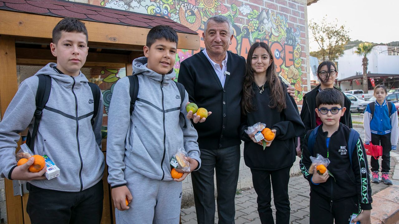 Başkan Günay, “Güzelbahçe‘de yaşayan çiftçilerimizin mandalinaları bu sene yine dalında kaldı para etmediği için köylümüz bunları toplayamadı biz de köylümüzün malını alarak ilçemizde bulunan devlet okullarına her gün dağıttığımız simit ve poğaçanın yanında bugün de mandalina dağıtıyoruz. Köylü satamadı biz de onları alıp buradaki çocuklarımıza dağıtıyoruz” diye konuştu.