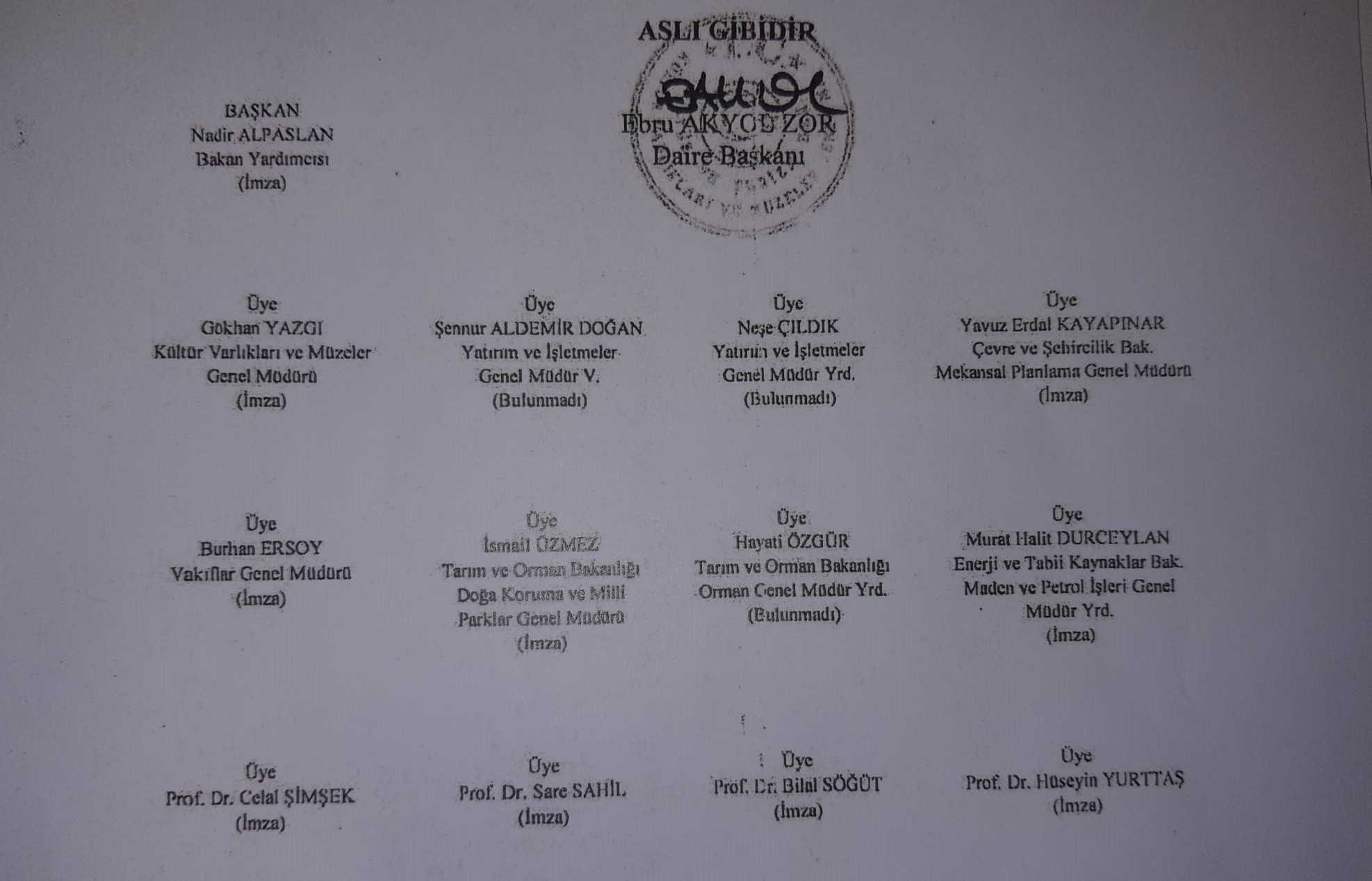 Kararda; toplantıya başkanlık yapan Kültür ve Turizm Bakanlığı Bakan Yardımcısı Nadir Alparslan, Kültür Varlıkları ve Müzeler Genel Müdürü Gökhan Yazıcı, Kurullar Dairesi Başkanı Ebru Akyol Zor, Çevre ve Şehircilik Bakanlığı Mekansal Planlama Genel Müdürü Yavuz Erdal Kayapınar, Vakıflar Genel Müdürü Burhan Ersoy, Tarım ve Orman Bakanlığı Doğa Koruma ve Milli Parklar Genel Müdürü İsmail Üzmez, Enerji ve Tabii Kaynaklar Bakanlığı Maden Petrol İşleri Genel Müdür Yardımcısı Murat Halil Durceylan gibi önemli isimlerin imzaları yer aldı. Ayrıca kararı çeşitli üniversitelerde arkeoloji ve tarih konularında bilimsel araştırmalarda bulan Prof. Dr. Celal Şimşek, Prof. Dr. Sare Sahil, Prof. Dr. Bilal Söğüt ve Prof. Dr Hüseyin Yurttaş da imzaladı.