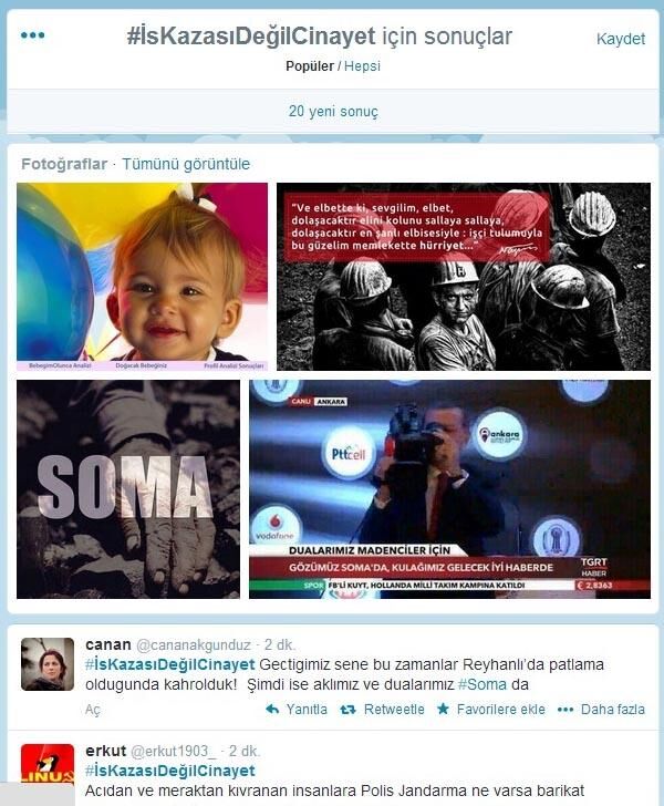 Manisa'nın Soma İlçesi'ndeki meydana gelen maden kazası için 'İsKazasıDeğilCinayet ve 'SomayaDuaEdelim' hashtag'leri ile twitter'ın dünya gündeminde ilk iki sıraya yükseldi. Paylaşılan hastaglarda 'Dualarınızı eksik etmeyin', 'Eyy en olmazları olduran... Ey çaresizlerin çaresi...Yalvarırım Sana' , 'Rabbim Senden Ümidini Kesmeyen Mazlum Kullarını Yanlız bırakma...', 'Ölmek madencilerin kaderinde var' diyen bi adamın başbakan sıfatı taşıdığı bir ülke burası', 'Patlamanın yaşandığı maden ocağı 09.07.2013 tarihinde Enerji ve Tabii Kaynaklar Bakanı Taner Yıldız tarafındanaçılmıştı', Sokakta, eylemde, gözaltında, askerde, madende, tersanede, fabrikada... ölmek için ne çok sebep var bu ülkede' ve 'Başbakan Ödül töreninde, İşciler toprak altında.. Halk Maden ocağı önünde..' gibi yorumlar yapıldı. (dha)