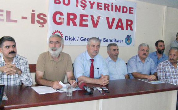 İZMİR - DİSK'e bağlı Genel-İş Sendikası sendikası binasında düzenlediği basın toplantısında yarın başlayacak grevle ilgili bilgilendirmede yaptı. DİSK Genel Başkanı Kani Beko'nun da katıldığı toplantında DİSK Ege Temsilcisi ve Genel-İş 3 No'lu Şube Başkanı Memiş Sarı, 7.5 aydan bu yana süren toplu iş sözleşmesi görüşmelerinde son aşamaya geldiklerini ve 26 Temmuz günü 04.00'den itibaren grevin başlayacağını açıkladı.