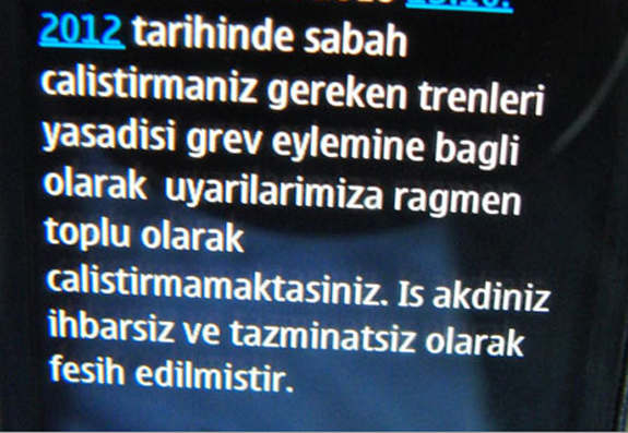 Grev kararı alan 13 makinistin iş akitleri anında cep telefonlarına gönderilen mesajla feshedilirken İZBAN yönetimi aylardır sonuçlamadığı için Yüksek Hakem Kurulu'nda olan toplu görüşmelere ilişkin sendika ile yeniden temasa başladı.