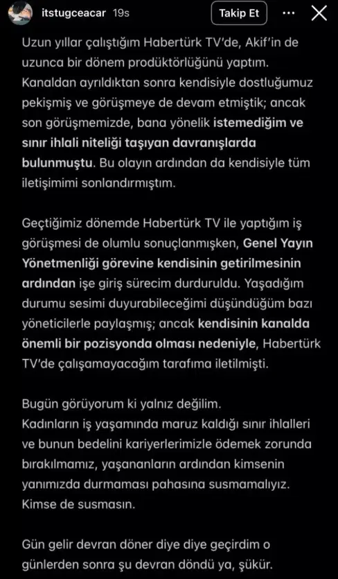 “Uzun yıllar çalıştığım Habertürk TV'de, Akif'in de uzunca bir dönem prodüktörlüğünü yaptım. Kanaldan ayrıldıktan sonra kendisiyle dostluğumuz pekişmiş ve görüşmeye de devam etmiştik; ancak son görüşmemizde, bana yönelik istemediğim ve sınır ihlali niteliği taşıyan davranışlarda bulunmuştu. Bu olayın ardından da kendisiyle tüm iletişimimi sonlandırmıştım.
