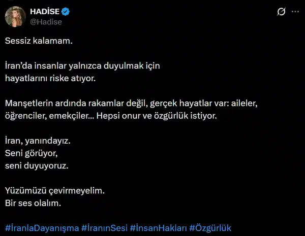 Hadise, İran’daki gelişmelere ilişkin yaptığı paylaşımda şu ifadelere yer verdi: