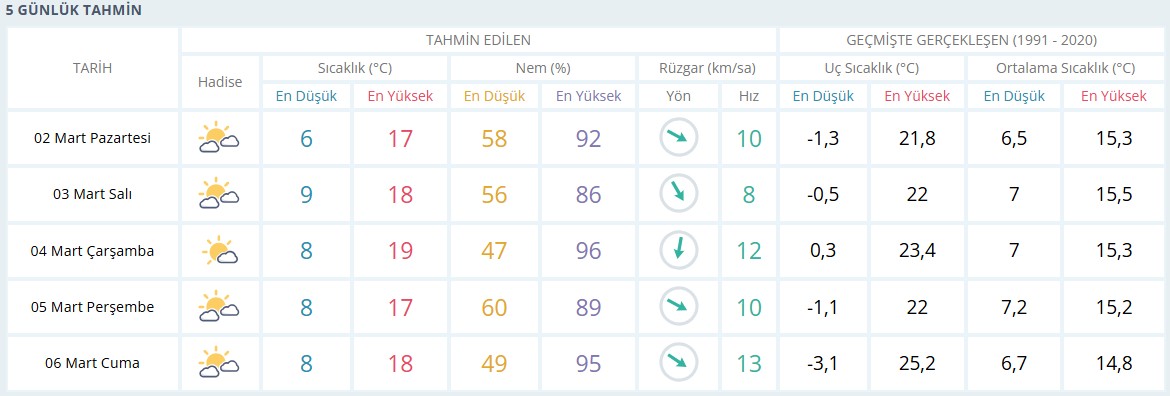 İzmir Hava Durumu ekibi ise haftalık yorum olarak, “Hafta boyu havamız bahar tadında olacak. Sıcaklıklar 17-19 dereceye kadar çıkacak. Kırsal ilçelerde 20 derece ve biraz üstü de görülebilecek. Güneşimiz bol bol gözükecek. 3-4 gündür üşüten rüzgâr da giderek hafifleyecek. Uzun bir süre yağmur yok. Barajlarda doluluk oranı artmaya devam etse de gelecek hafta artış duracak” dedi.