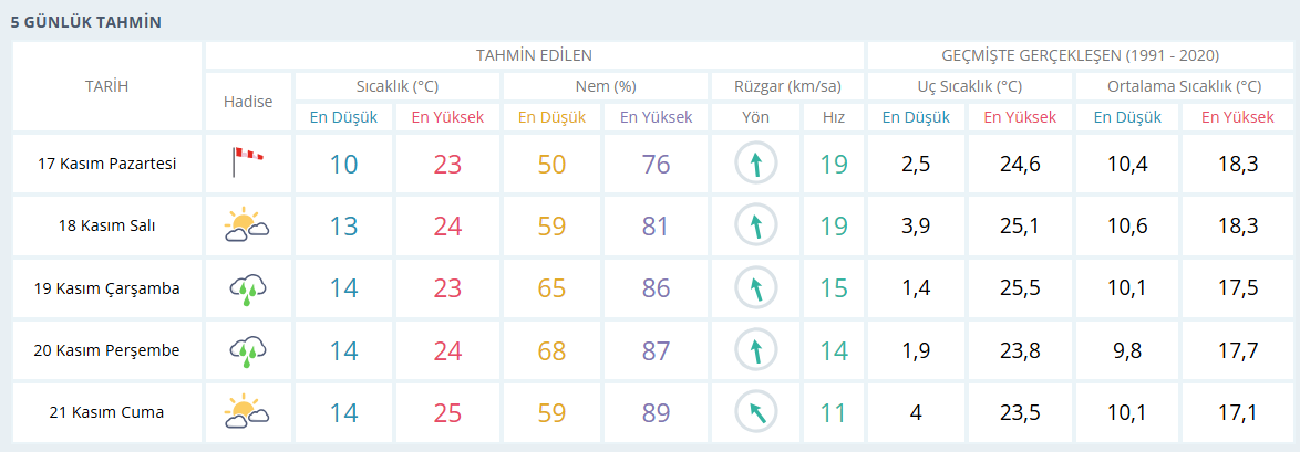 Gelecek hafta hava sıcak ve nemli olacak. Sıcaklıklar 25 dereceye kadar çıkacak. Gece sıcaklıkları da güneyli rüzgârla 14-15 dereceye çıkacak. Bu hafta havamız Mayıs'ı hatırlatacak. Önemli bir yağış beklemiyoruz; sadece Perşembe günü ufak tefek yağış geçişleri olabilir. Kasım şimdilik bize bir şey vermedi ama Kasım'ın son günleri oldukça hareketli geçebilir. 25 Kasım'dan itibaren yağış olarak yüzümüz gülebilir.