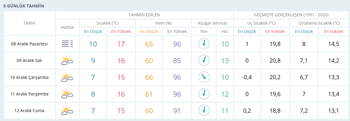 Havanın hafta boyunca ortalama 16°C olması beklenirken gece sıcaklıklarının ise ortalama 8°C olması bekleniyor.