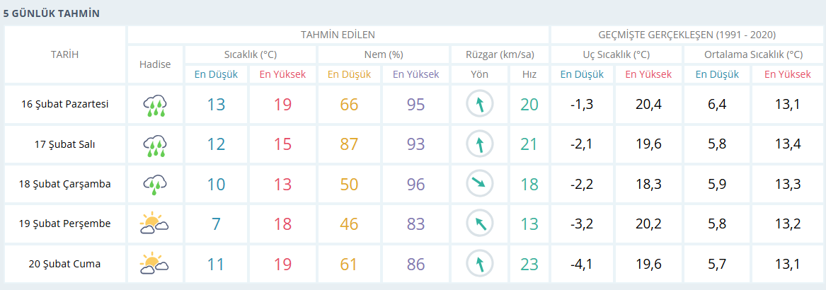 Pazartesi günü gece saatlerinden itibaren başlayan yağışlar gün boyu devam edecek. Kuvvetli sağanak yağışın olacağı belirtilirken, hava koşulları sebebiyle kentte olumsuzluklar yaşanabileceği aktarıldı. Gün içerisinde rüzgar hızının ise maksimum 33 km/sa olacağı belirtildi. Hava sıcaklığı ise gün içinde en yüksek 19°C olacak.