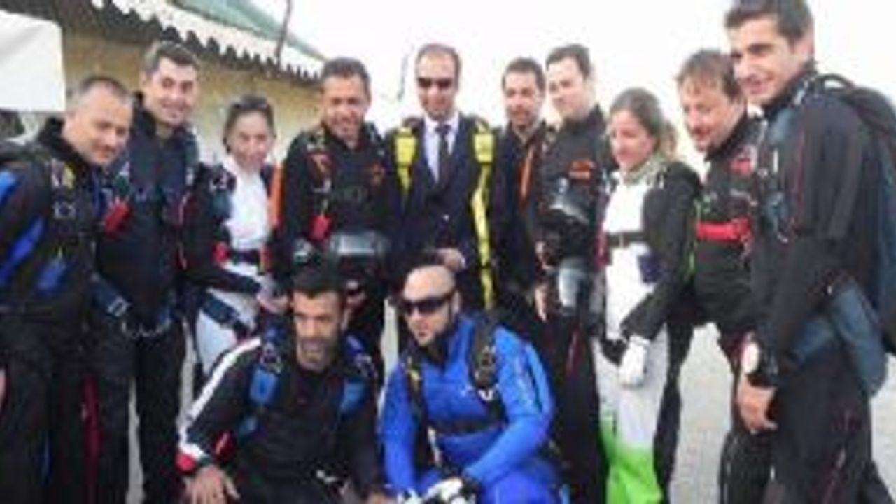 Türk Hava Kurumu'nun (THK) desteğiyle, Türk Silahlı Kuvvetleri'nin (TSK) paraşüt şampiyonalarında kullanılan CASA tipi uçağı ile 18 bin ft'ten beş atlayış gerçekleştiren paraşütçüler, 220 kilometre hızla düşerken havada buluşup, önceden belirlenmiş formasyonları gerçekleştirdi.