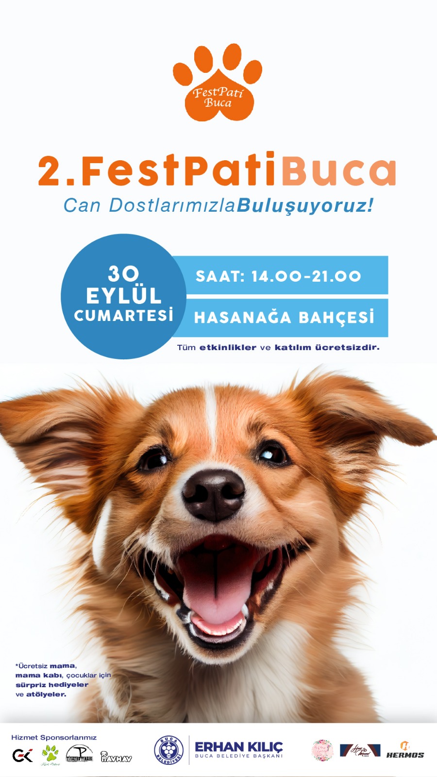 Can dostlarının her türlü ihtiyaçlarında yanında olan Buca Belediyesi, bu kez patili dostlar ile hayvanseverleri festivalde ağırlayacak. Hasanağa Bahçesi'nde 30 Eylül Cumartesi günü 14.00 ile 21.00 saatleri arasında gerçekleştirilecek FestpatiBuca'da, birbirinden renkli etkinlikler yer alacak. Buca Belediyesi etkinlikte 'kap bizden mama sizden' diyerek ücretsiz mama kabı dağıtacak.