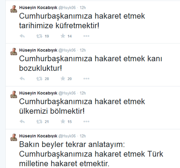 Bu arada Kocabıyık da Twitter mesajlarına devam etti. Turkuvaz Medya Grubu Ege Temsilcisi ve Yeni Asır Yazarı, 'Cumhurbaşkanımıza hakaret etmek ülkeyi bölmektir, halka hakarettir, kanı bozukluktur' mesajları gönderdi.