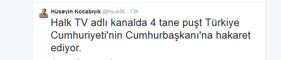 Kocabıyık, Twitter hesabından 'Halk TV adlı kanalda 4 tane puşt Türkiye Cumhuriyeti'nin Cumhurbaşkanı'na hakaret ediyor' mesajını gönderdi.