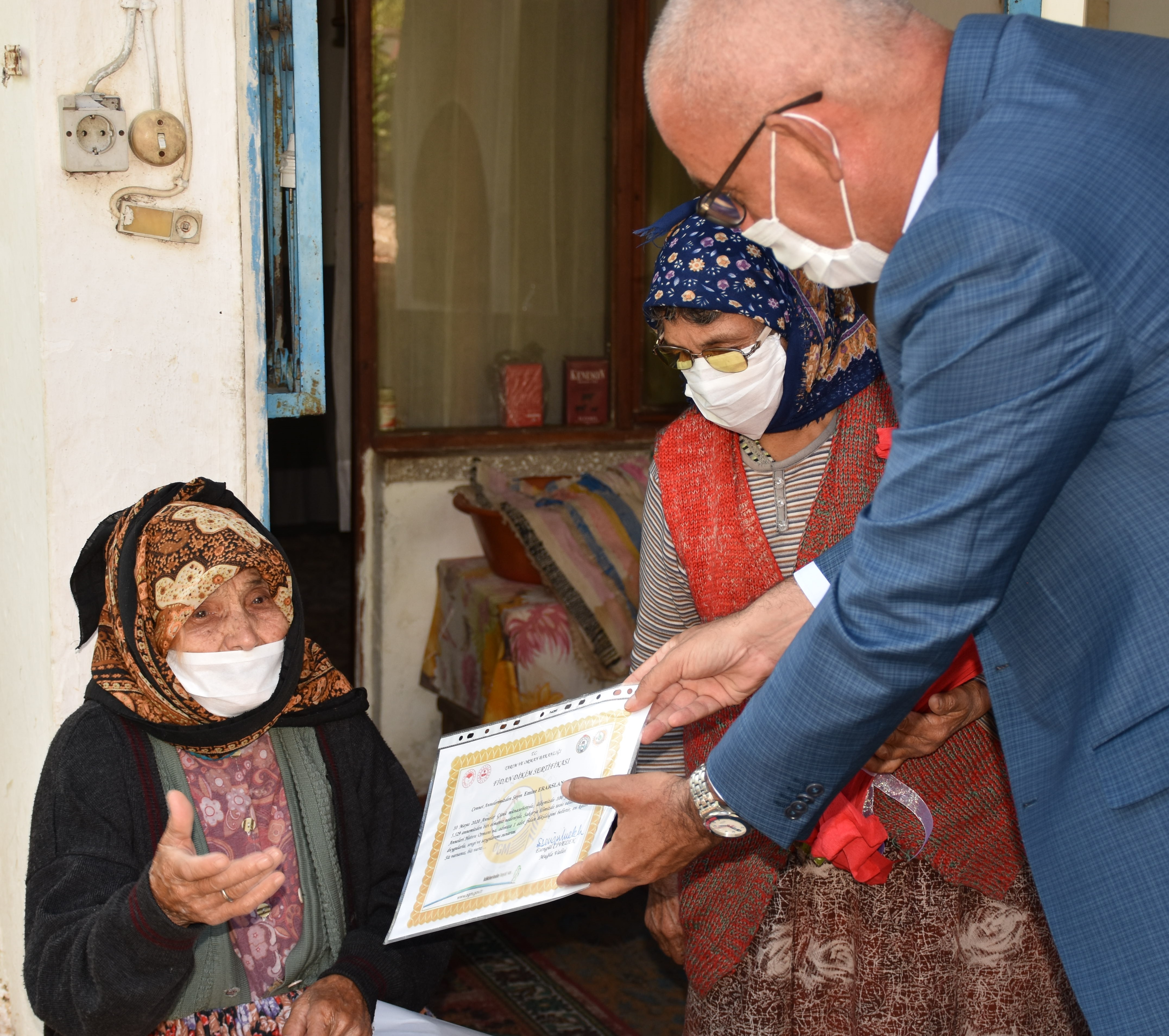 Aksoy ve beraberindekiler daha sonra Çamlı Mahallesi'nde 101 yaşındaki Emine Eraslan'ı evinde ziyaret etti.