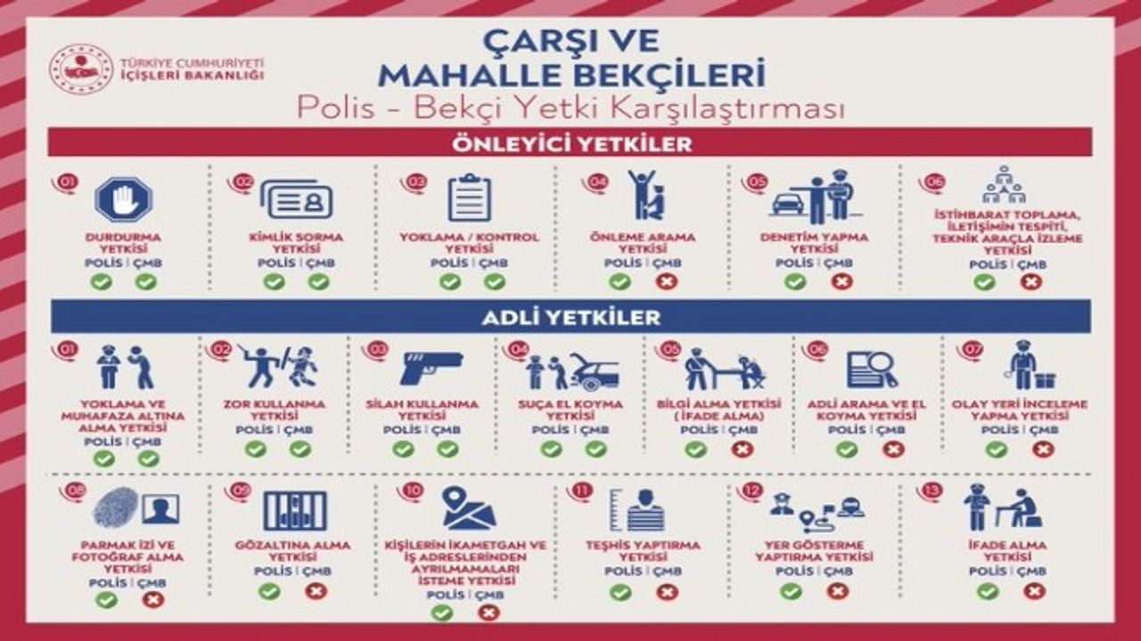 İçişleri Bakanlığı'nın sosyal medya hesabından yapılan açıklamada, 'Polis-Bekçi Yetki Karşılaştırması' başlığıyla yayımlanan tabloda, önceliyici ve adli yetkiler grafiklerle anlatıldı.