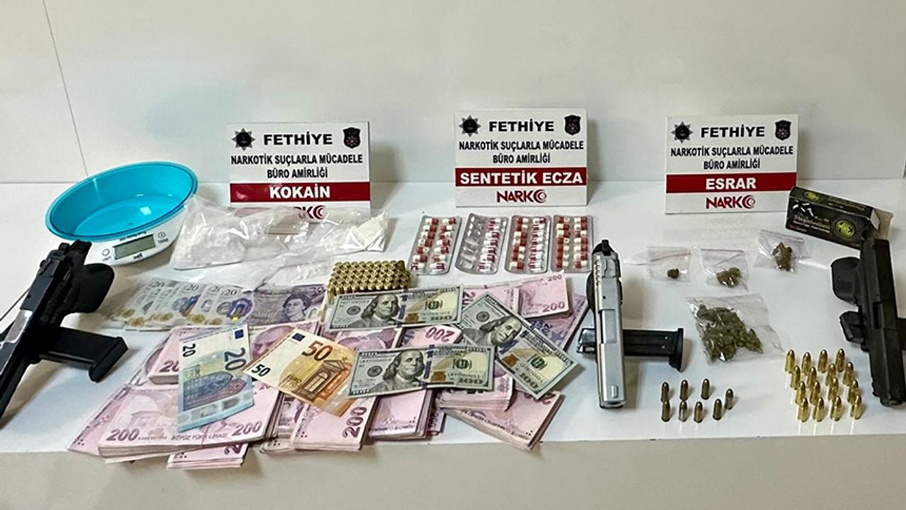 Belirlenen adrese yapılan operasyonda, 1 kilo 256 gram esrar, 101 gram kokain, 49 sentetik ecza, 12 kök Hint keneviri, 3 ruhsatsız tabanca, 74 fişek, suçtan elde edildiği değerlendirilen 132 bin 800 lira, 700 dolar, 220 pound ve 70 avro ele geçirildi.